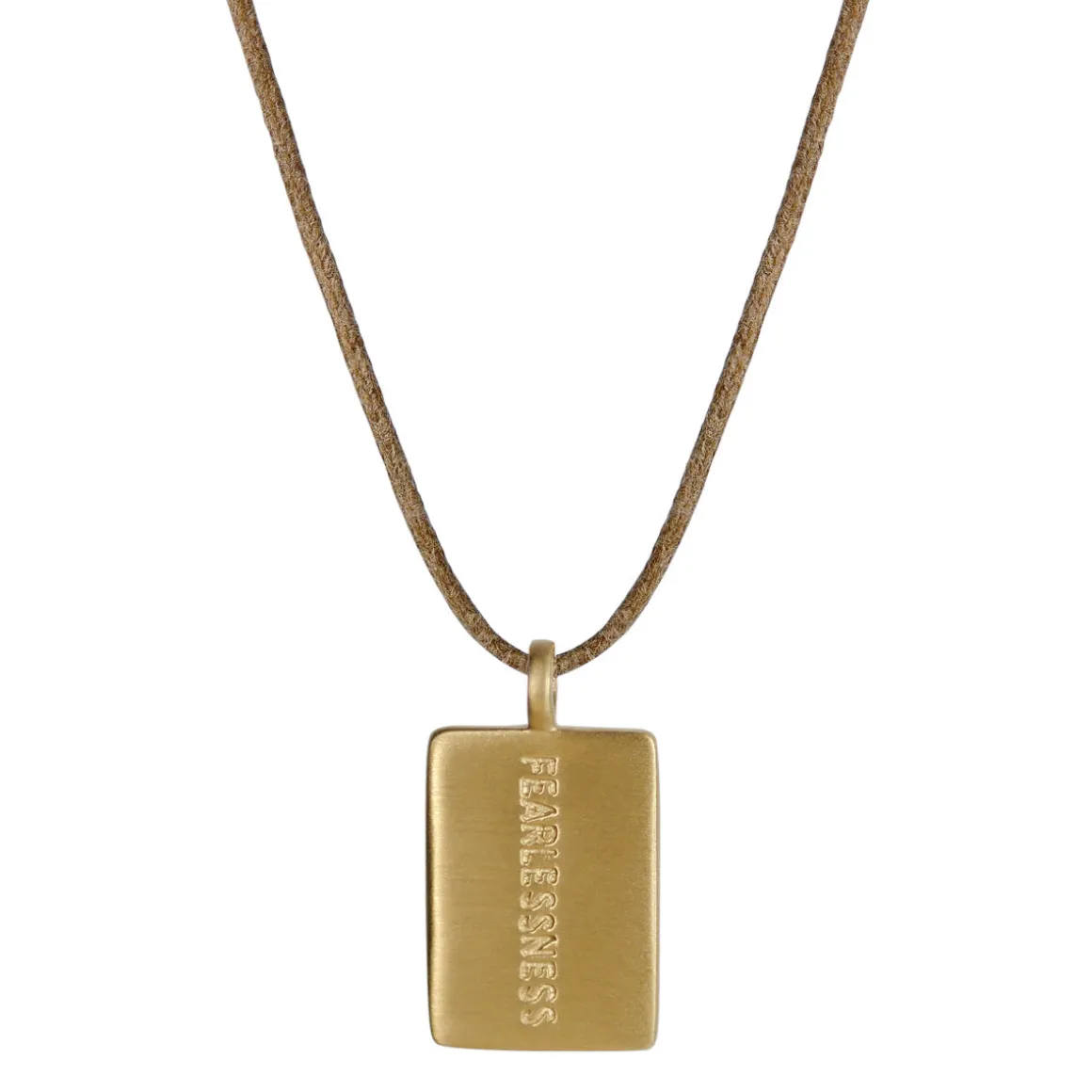 This recycled 10K gold pendant brings a graceful twist to the classic dog tag design, engraved with “Fearlessness”, reminding us to approach life with an open heart and to be strong in the face of life’s adversities. The pendant is engraved on the back with “Joyful Heart” and measures 1/2″ wide by 3/4″ long, hanging from a natural cotton cord that adjusts from 16″ to 36″. 10% of the sale from each pendant goes directly to Joyful Heart Foundation.