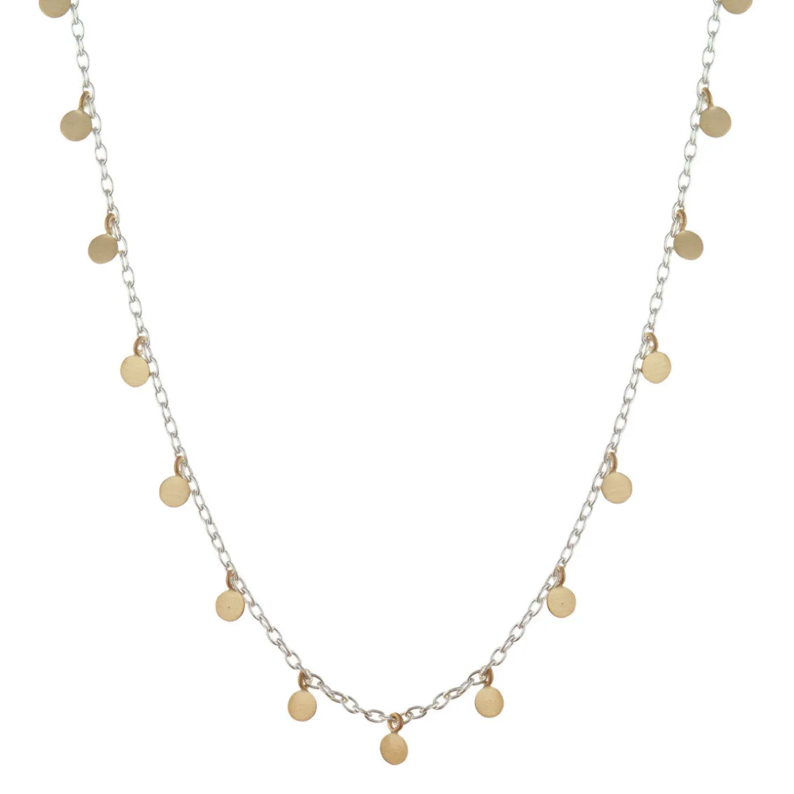 This delicate and sexy necklace features recycled 10K gold discs that dangle from a silver cable chain with a lobster claw clasp. It moves gently and reflects light beautifully. A timeless necklace that can be worn day or night. Available in 16″ and 18″ chain, the discs measure approximately 3/16″.