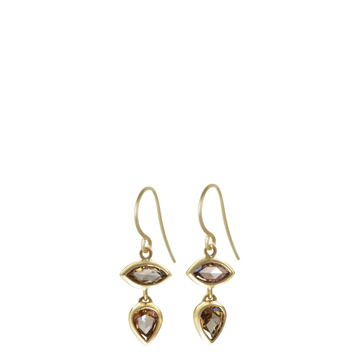 18K Gold 2.23 Carat Natural Cognac Rose Cut Double Diamond Drop Earrings