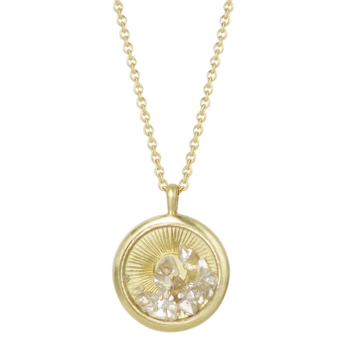 This one of a kind 18K Floating Diamond – Illuminated Sun Pendant is filled with 1.5 carats of white diamond slices in an array of sizes ranging from 1 to 4.5mm. The diamonds move freely behind a sapphire crystal disc, slightly obscuring a hand engraved sun with rays emanating outwards. The sun symbolizes the light within us and represents all of life, with its warmth and life-giving, flower-blooming energy.