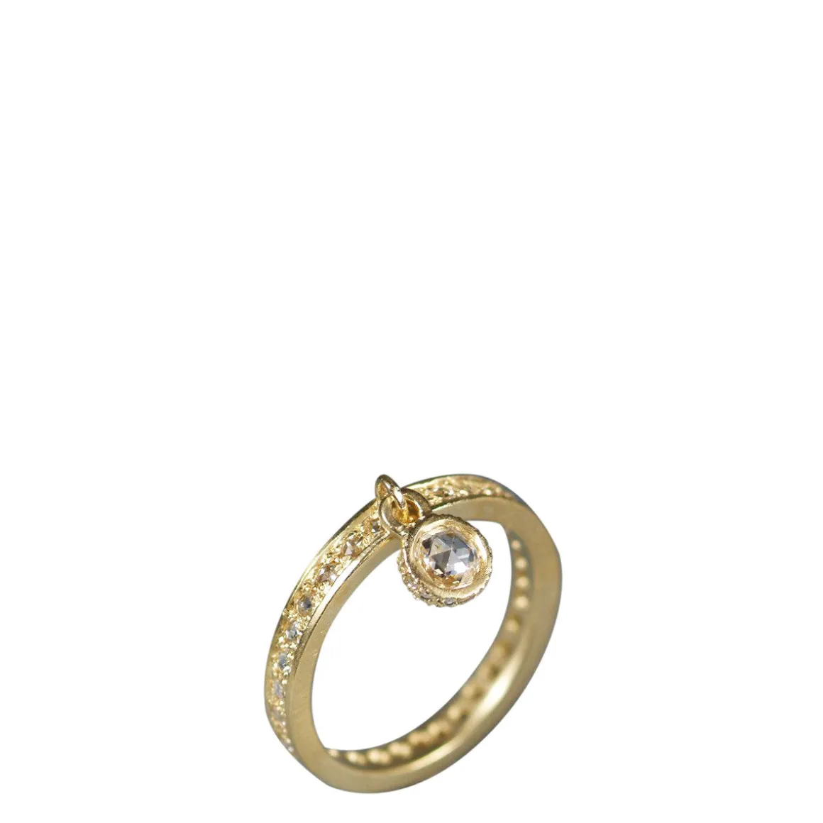 Two beautiful 4mm rose cut diamonds are perfectly set back to back on this ring that dangles. The center rose cut diamonds are surrounded by smaller 1mm pave set rose cut diamonds. The recycled 18K gold band measures approximately 2mm in width and is pave set all the way around with 1.6mm rose cut diamonds. The ring is available in size 7.25. The approximate total carat weight is 1.09. All diamonds are conflict free.