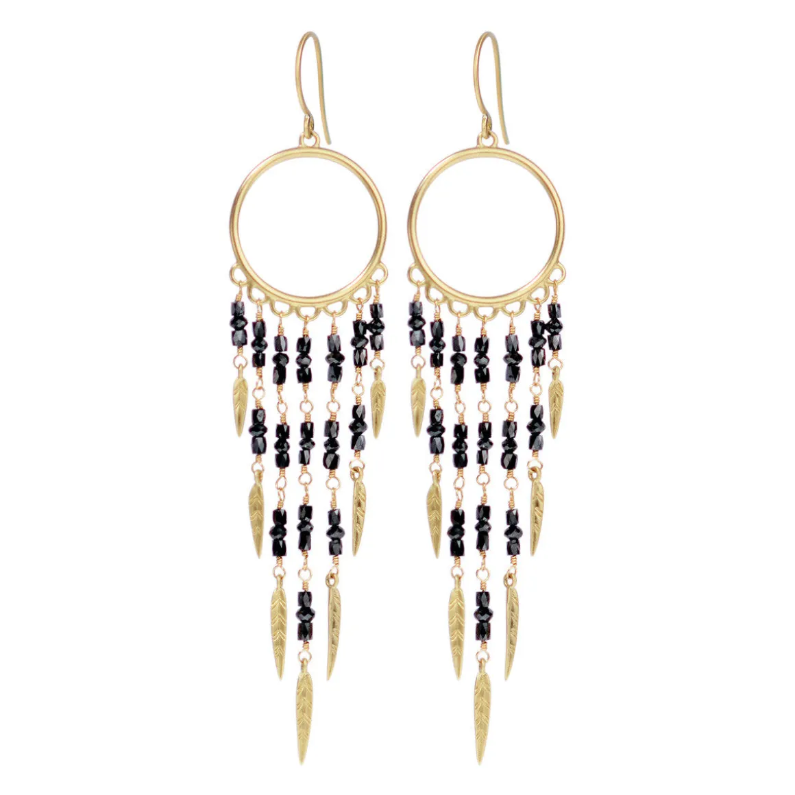 Native American dream catchers are believed to protect one from evil, and give its owner good dreams. These hand beaded earrings feature 7 strands of natural black diamond beads that each end with a recycled 18K gold feather. The strands vary in length from 3/4″ to 2 1/4″ in length, with the entire earring measuring 3″ in length and 3/4″ in width from 18K gold ear wire. The approximate total carat weight is 9.6. All diamonds are conflict free.