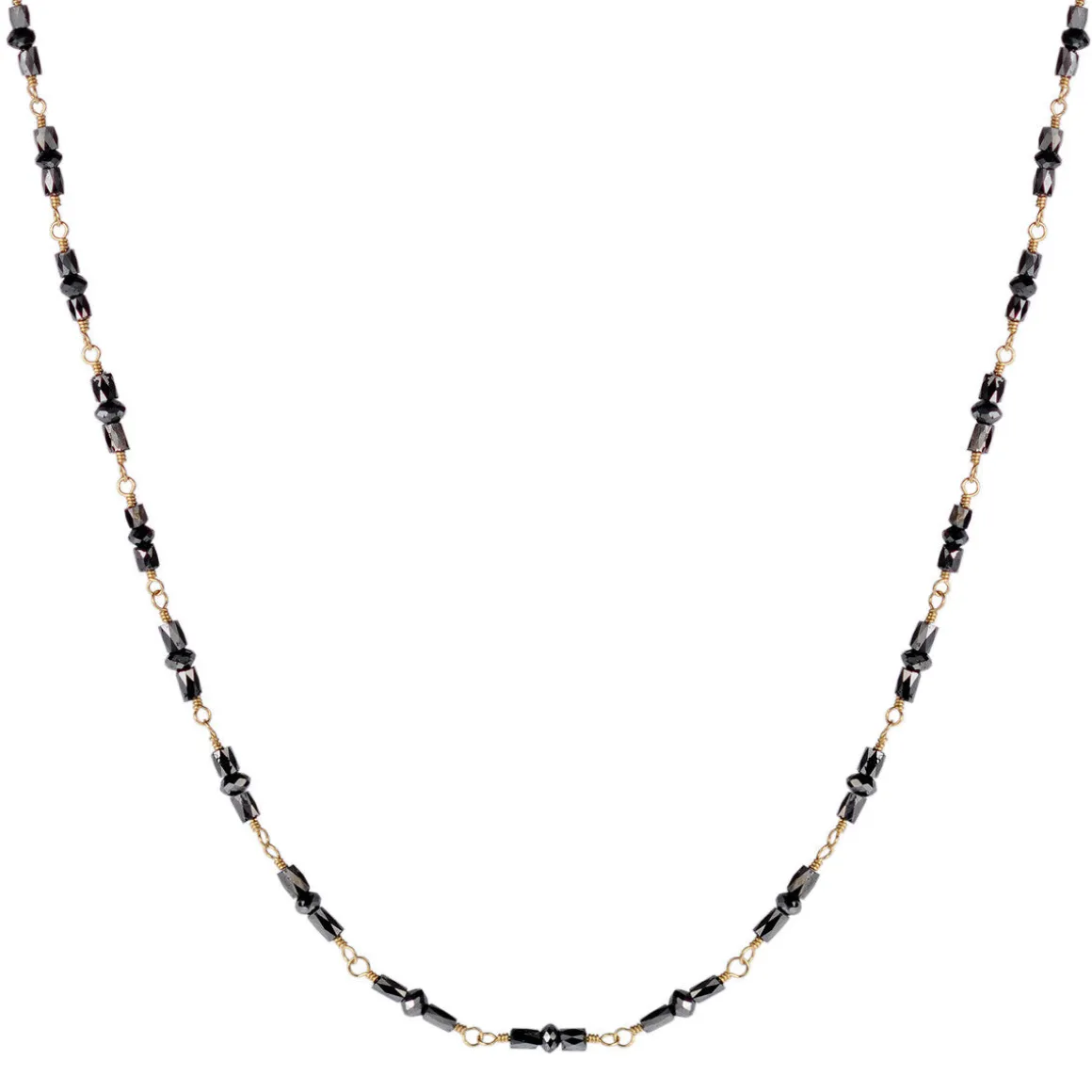 This recycled 18K gold chain features natural black diamond rondelle and tube beads, reminiscent of early 1970’s bohemian glamour. Trios of black diamond tube and rondelle beads are hand wrapped onto recycled 18K gold chain, for an elegant and exotic look. Each trio is approximately 1/4″ spaced apart and is available on a 16″ and 18″ with an easy lock closure. The approximate total carat weight is 10.8. All diamonds are conflict free.