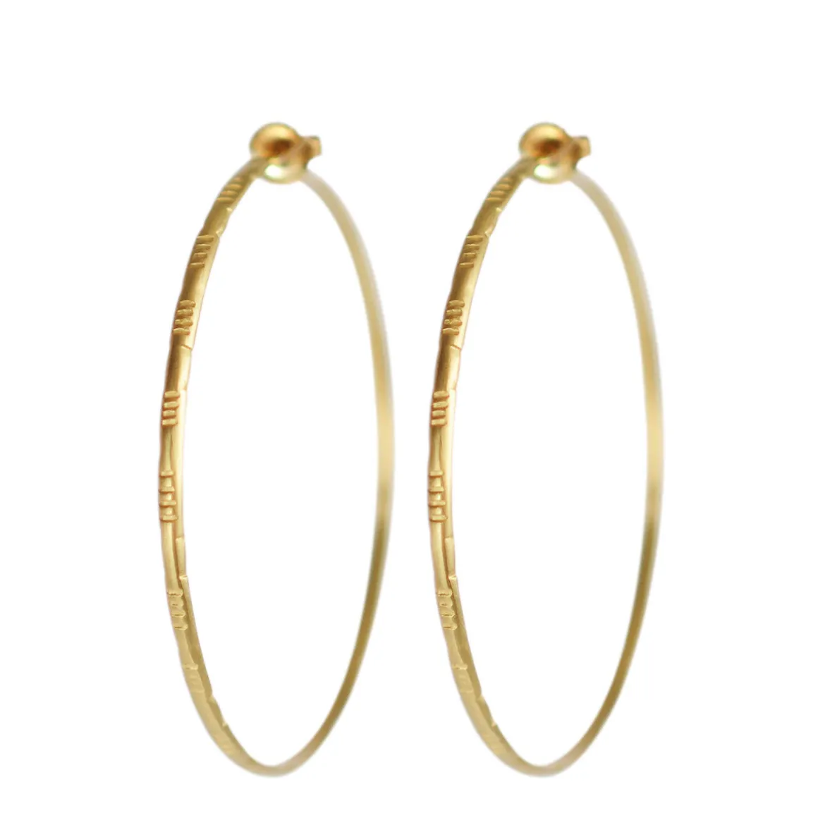 The perfect hoop! These delicately etched Moroccan hoops are made out of recycled 18K gold. Each hoop measures approximately 2″ in diameter with a post and ear nut closure.