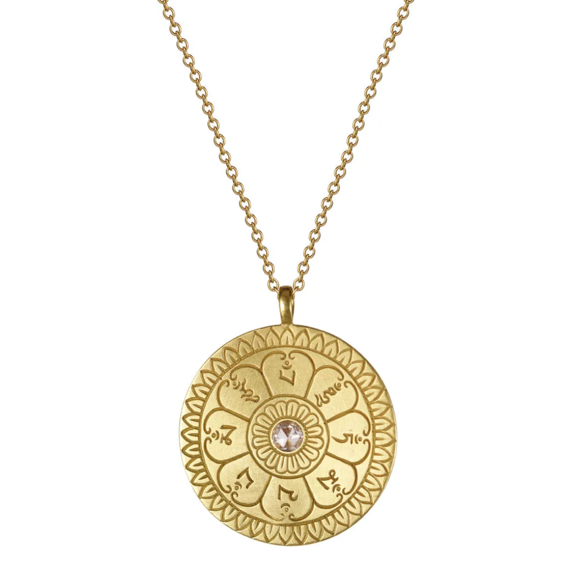The hand bell is an essential element in Tibetan rituals. This recycled 18K gold disc, measuring approximately 1″ in diameter, is engraved with the 8 bodhisattvas in the form of a lotus flower. Each petal has a symbol of the 8 goddess offerings: beauty, flowers, garlands, incense, song, light, dance and perfume. The pendant hangs on a 16″ or 18″ 18K gold chain with a hook-and-eye clasp with a rose cut diamond in the center. The approximate total carat weight is 0.25. All diamonds are conflict free.
