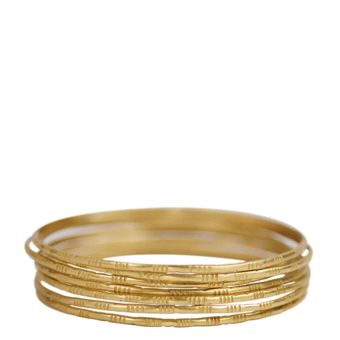 Simple and beautiful, a set of seven delicately etched bangles are made out of recycled 18K gold. Great for stacking, each bangle measures approximately 1/16″ in width and 2 1/2″ in diameter.