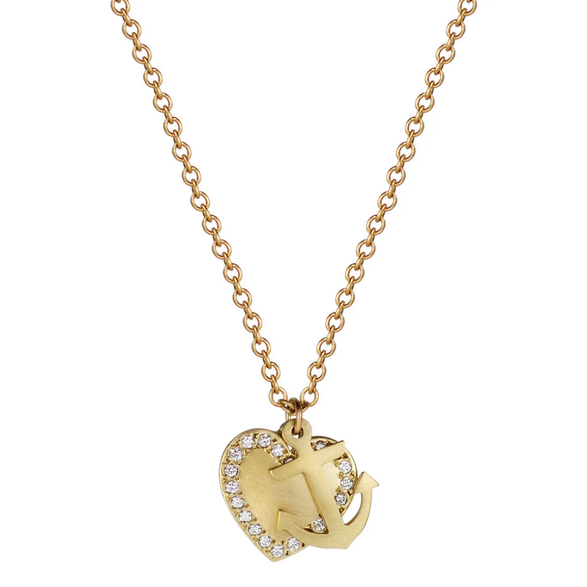 Designer Robin Renzi created this custom pendant to benefit The Mothers Center at The Sloane Hospital for Women, one of the first of its kind to provide comprehensive care for women. This recycled 18K gold pendant features an anchor and heart, symbolizing hope and unconditional love, with a border of diamonds surrounding the heart. The anchor measures approximately 3/8″ at its widest point and approximately 1/2″ in length. The heart measures approximately 1/2″ in diameter. The engraving on the back of the heart reads “The Mothers Center NYP.” The pendant is available on 18″ chain and is finished with a round lobster closure. The approximate total carat weight is 0.176. 10% of the sale from each pendant goes directly to The Mothers Center at The Sloane Hospital for Women.