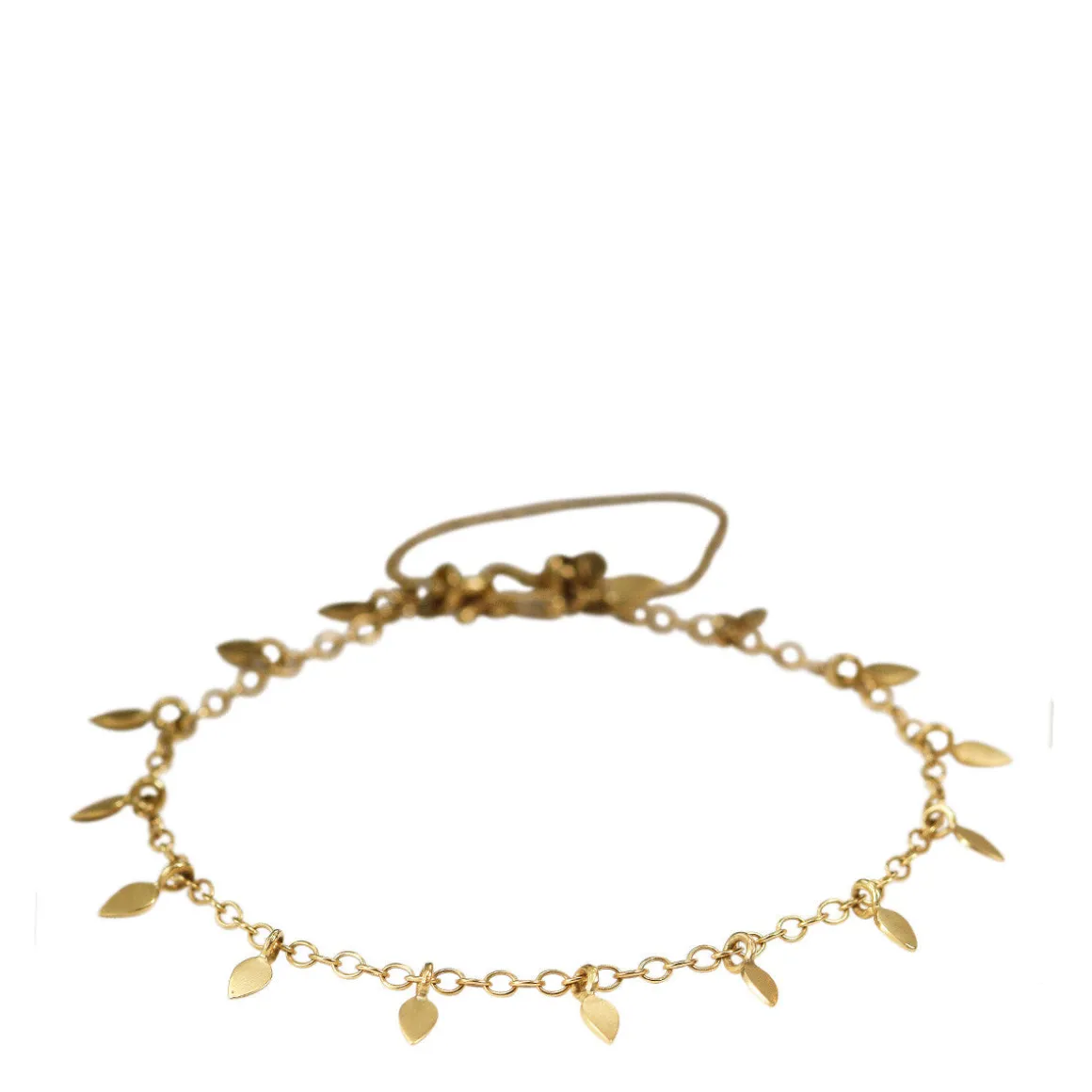 Great for everyday wear: this classic recycled 18K gold bracelet features 15 delicate tiny petals that beautifully catch and reflect the light. The bracelet measures 7″ in length and is closed with a hook and eye clasp with a safety chain.