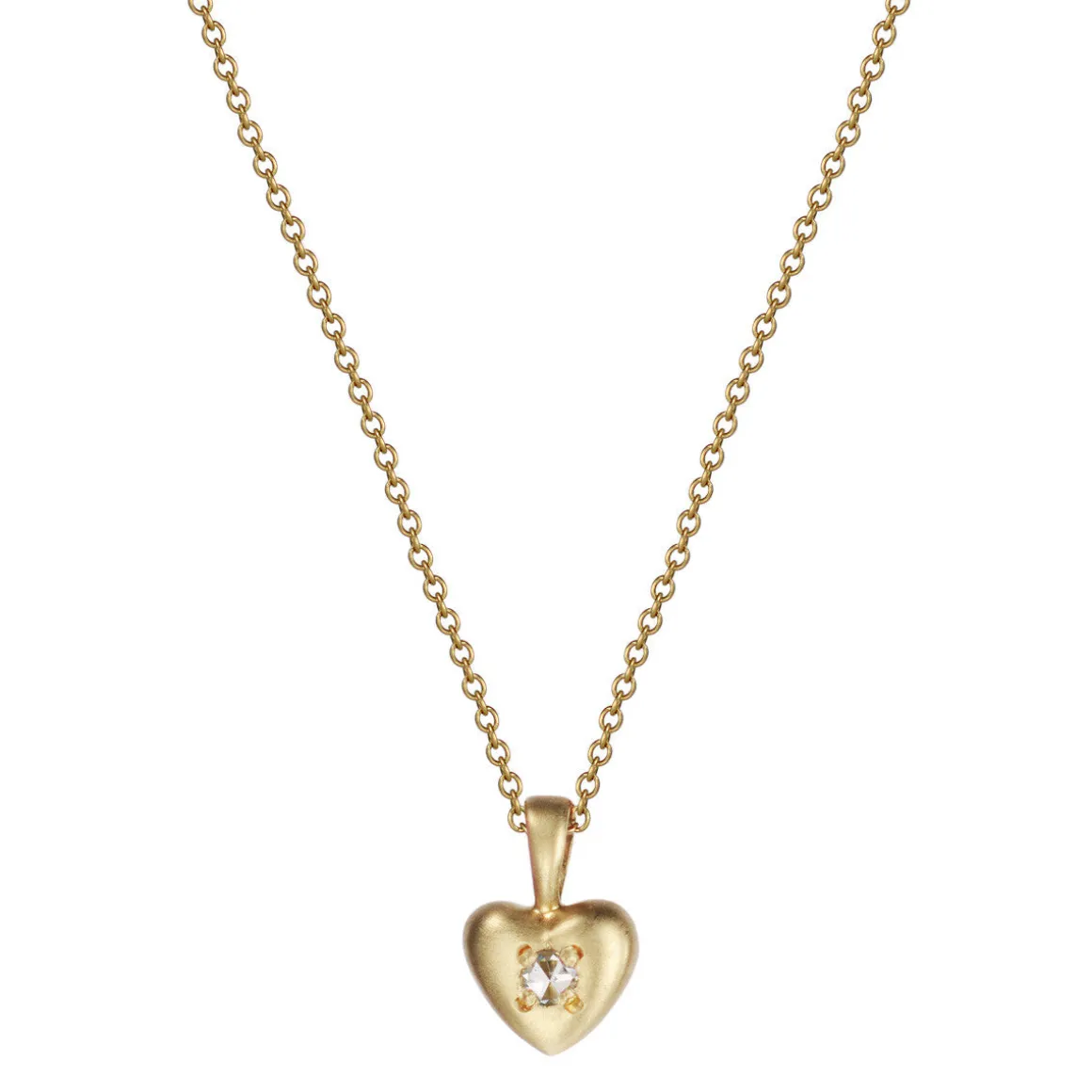 The heart has become an emblem of love, friendship, intelligence and courage. This delicate recycled 18K gold heart pendant measures approximately 3/16″ in diameter, and is set with a rose cut diamond. The heart is available on 16″ or 18″ 18K gold chain and has a spring ring closure. All diamonds are conflict free.
