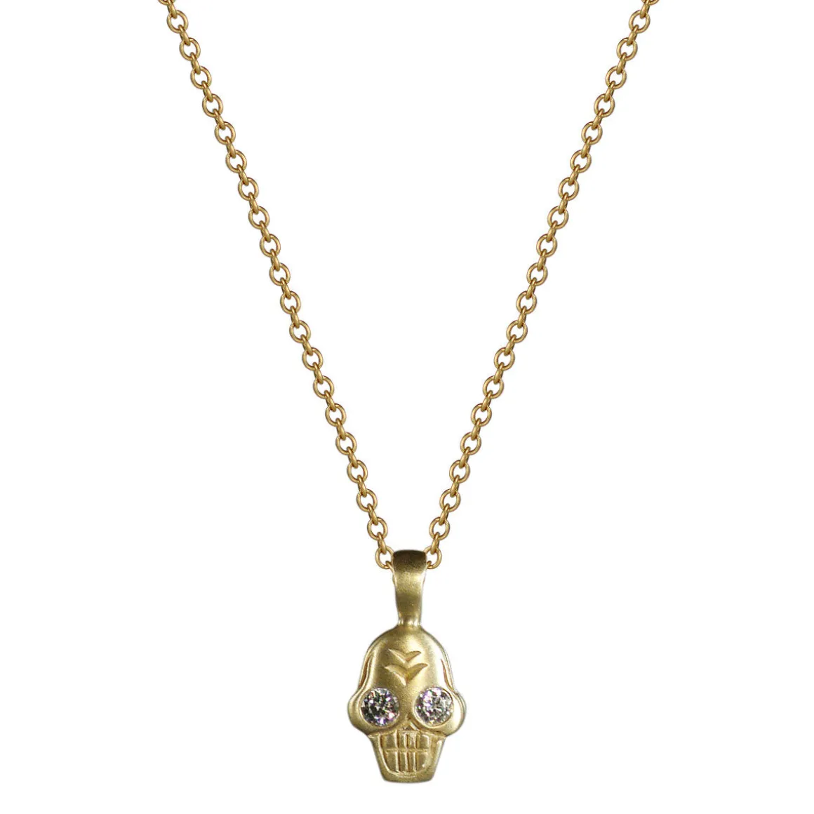 The skull is a reminder that all things will pass, that there is wisdom in living in the face of such mortality, and therefore, we should live fully and mindfully. This tiny recycled 18K gold skull charm is set with two diamonds on the front and 2 diamonds on the back, and hangs from a 16″ or 18″ 18K gold chain with a hook-and-eye closure. The skull measures approximately 1/2″ in length and 1/4″ in width. The approximate carat weight is 0.1. All diamonds are conflict free.