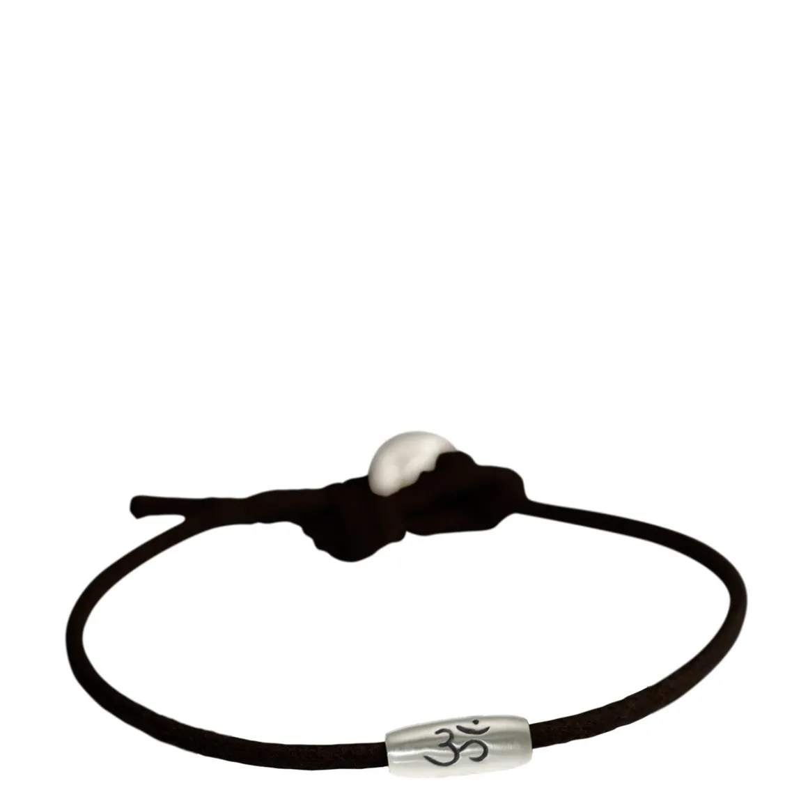 ‘Om’ is the sound of the Universe -Representing the three worlds and the powers of creation, preservation, and destruction, the Sanskrit symbol for ‘Om’ is engraved on a recycled sterling silver tube bead. The bead measures approximately 1/2″ long and sits on ablackcolored waxed cotton cord that wraps around the wrist with a button closure. Simple and comfortable, the bracelet measures 8″ in length.