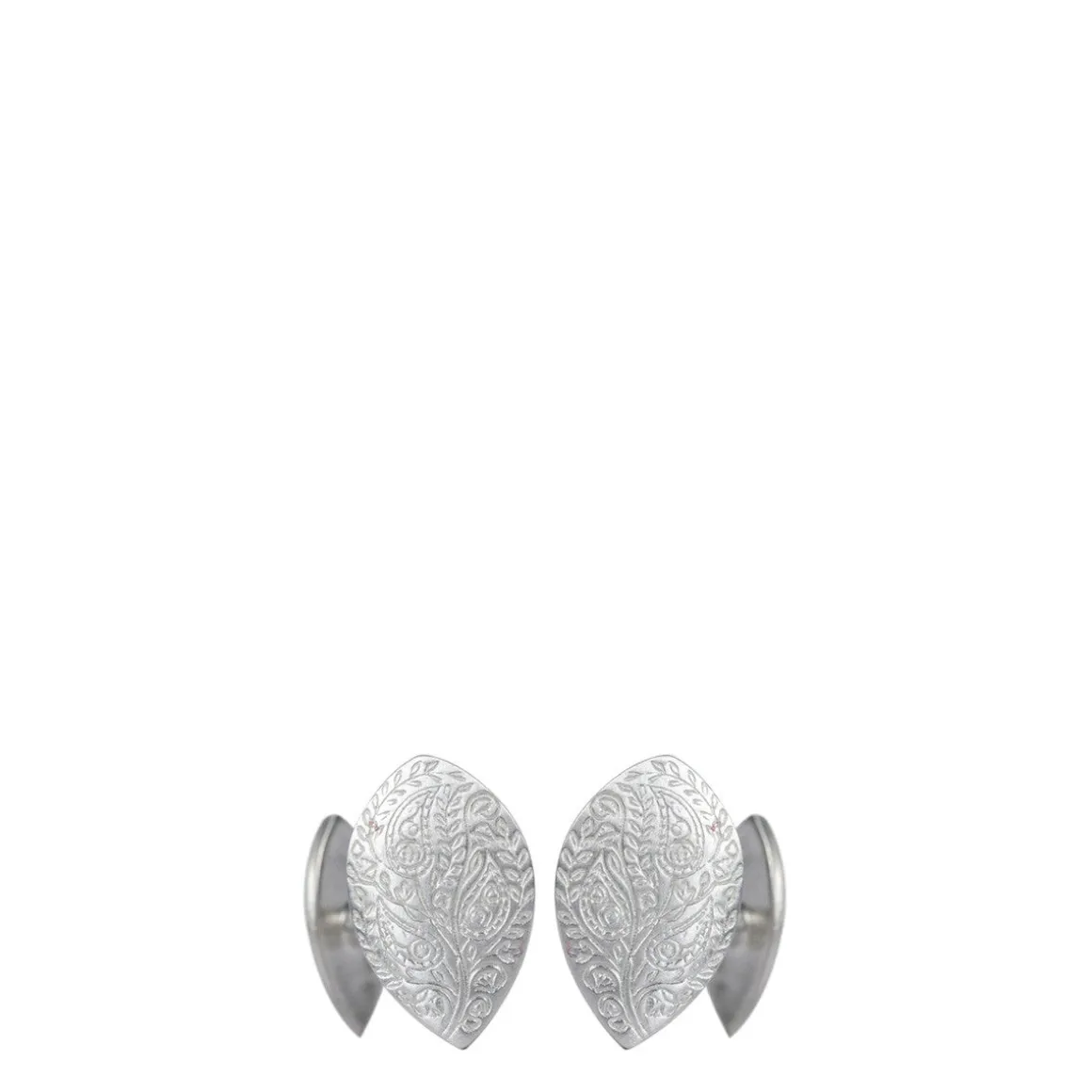 An intricate paisley pattern is engraved on the surface of these recycled sterling silver leaf cufflinks. The larger leaf measures approximately 3/4″ in length by 3/8″ in width, and the smaller leaf measures 1/2″ in length and 1/4″ in width.