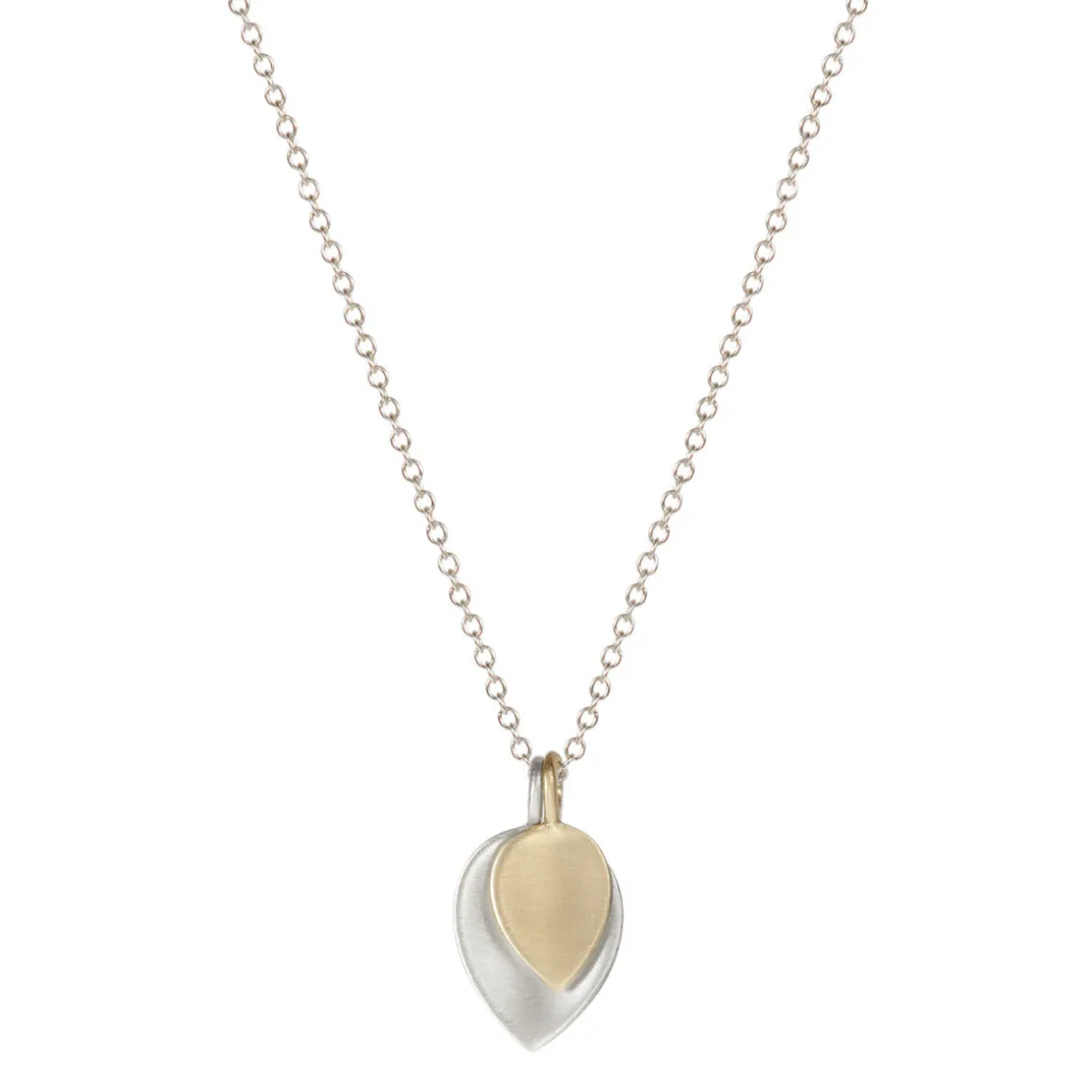 The lotus flower is the heart’s inner shrine. It is the symbol of creation and manifestation in the Hindu religion: “… and from her belly button grew a lotus flower and out of the lotus the creation of the world.”A recycled sterling silver lotus petal measuring 3/8″ wide and 7/16″ long lies beneath a smaller recycled 10K gold petal measuring approximately 1/4″ wide and 5/16″ long.Available in 16” or 18” lengths, this pendant is finished with a spring ring closure.