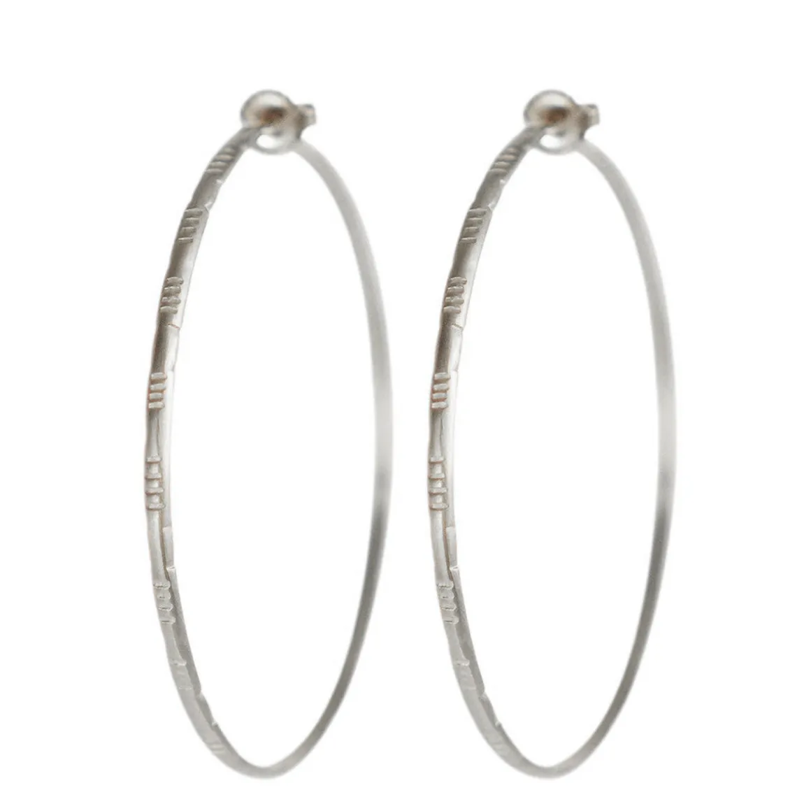 The perfect hoop! Endless and lightweight, these delicately etched Moroccan hoops are made out of recycled sterling silver. Each hoop measures approximately 2.5″ in diameter and 3/16″ in width with a post and ear nut closure.