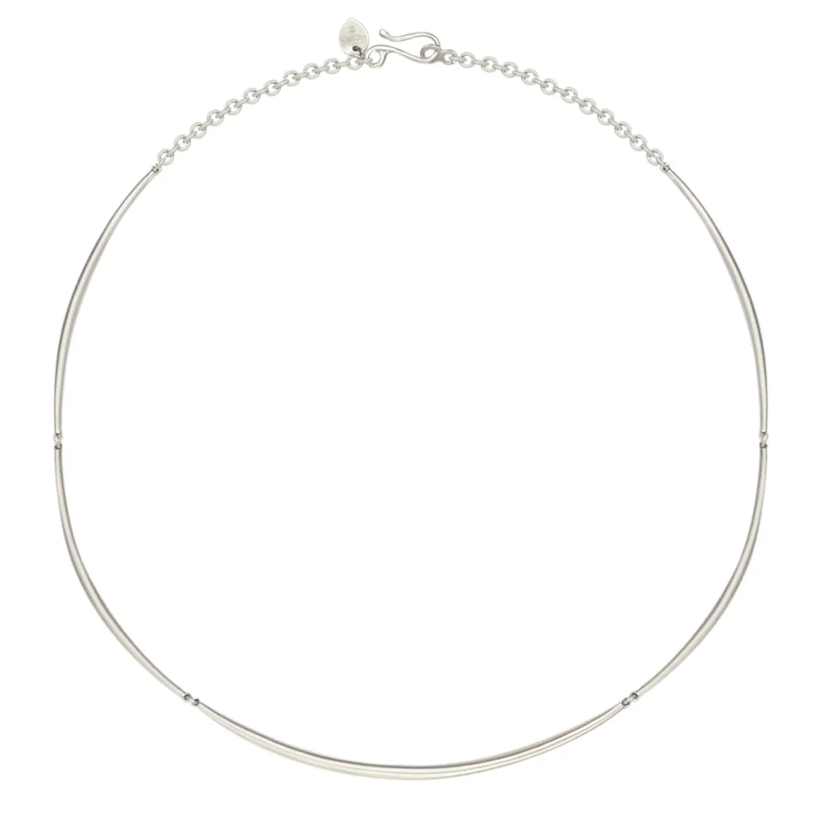 The Tibetan Bar Collection was inspired by an antiqueTibetan necklace and grew to explore lush graduating lines and curvature. This silver chain has a modern aesthetic with elegant graduating lines. They hang heavy at the center while floating lightly away at their ends. The central bar in this full linked necklace measures 3 3/8” long and is 3.8mm at its thickest point. It is joined on both ends by two finer bars measuring 2 1/4” long and 2.8mm thick. This 16” recycled sterling silver necklace creates a cleverly imperfect circle, an uncanny crescent. Finished with sterling silver chain on the ends and hook and eye closure.