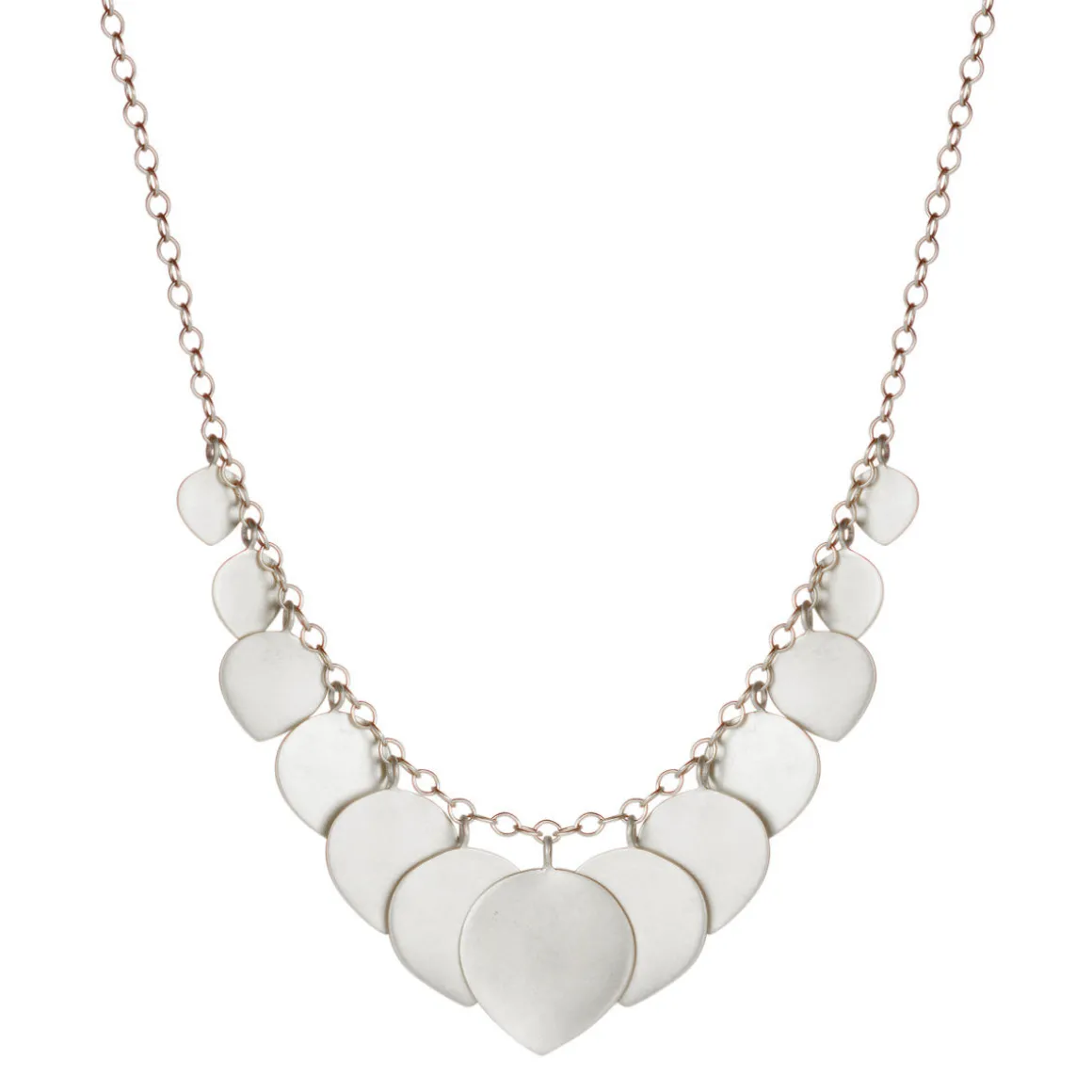 The lotus flower, Padma, represents the perfection of beauty and is considered the heart’s inner shrine. A recycled sterling silver chain features 13 graduated lotus petals, inviting in the good wishes of ‘Padma’. The lotus petals vary in size from approximately 3/8″ diameter to 3/4″ in diameter on a 16″ or 18″ sterling silver chain with a handmade hook and eye closure.