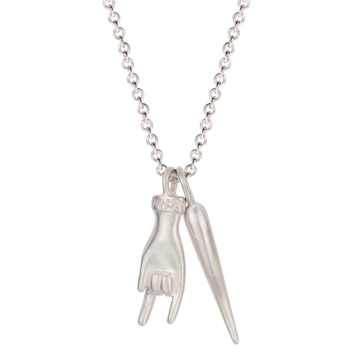 Designer Robin Renzi re-created this trinket pendant to commemorate the 25th anniversary of Me&Ro. The Cornuto hand and Italian horn were gifts from her Italian grandmother. “I believe now as I did then that by wearing these charms I was empowered to be strong, to believe in myself and to feel love.” The hand measures approximately 5/8” in length and 1/4″ in width. The Italian horn measures 3/4” in length and 1/8” at its widest point. The pendant isavailable on a 16” or 18” sterling silverchain finished with a lobster clasp closure.