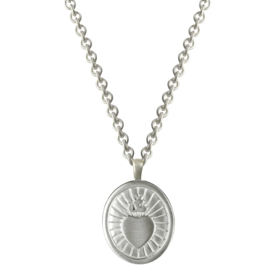 The Heart represents the most intimate central point of the human being from which we communicate with other people and the Divine. It has long been recognized across cultures as a symbol of charity, joy and compassion. This recycled sterling silver pendant, measuring 7/8″ in length and 5/8″ in width is engraved with a heart and a flame, which represents protection and purification. This pendant hangs on a 18″ and 22″ heavy cable chain with a lobster claw closure.