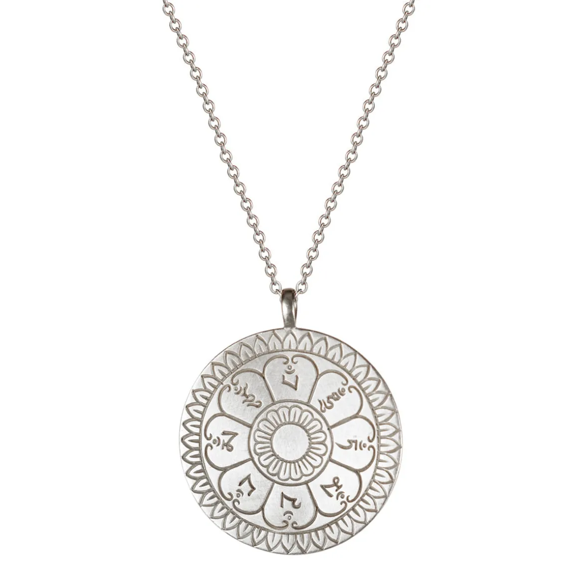 The hand bell is an essential element in Tibetan rituals. This recycled sterling silver disc, measuring approximately 1″ in diameter, is engraved with the 8 bodhisattvas in the form of a lotus flower. Each petal has a symbol of the 8 goddess offerings: beauty, flowers, garlands, incense, song, light, dance and perfume. The pendant hangs on a 16″ or 18″ silver chain with a small lobster clasp.