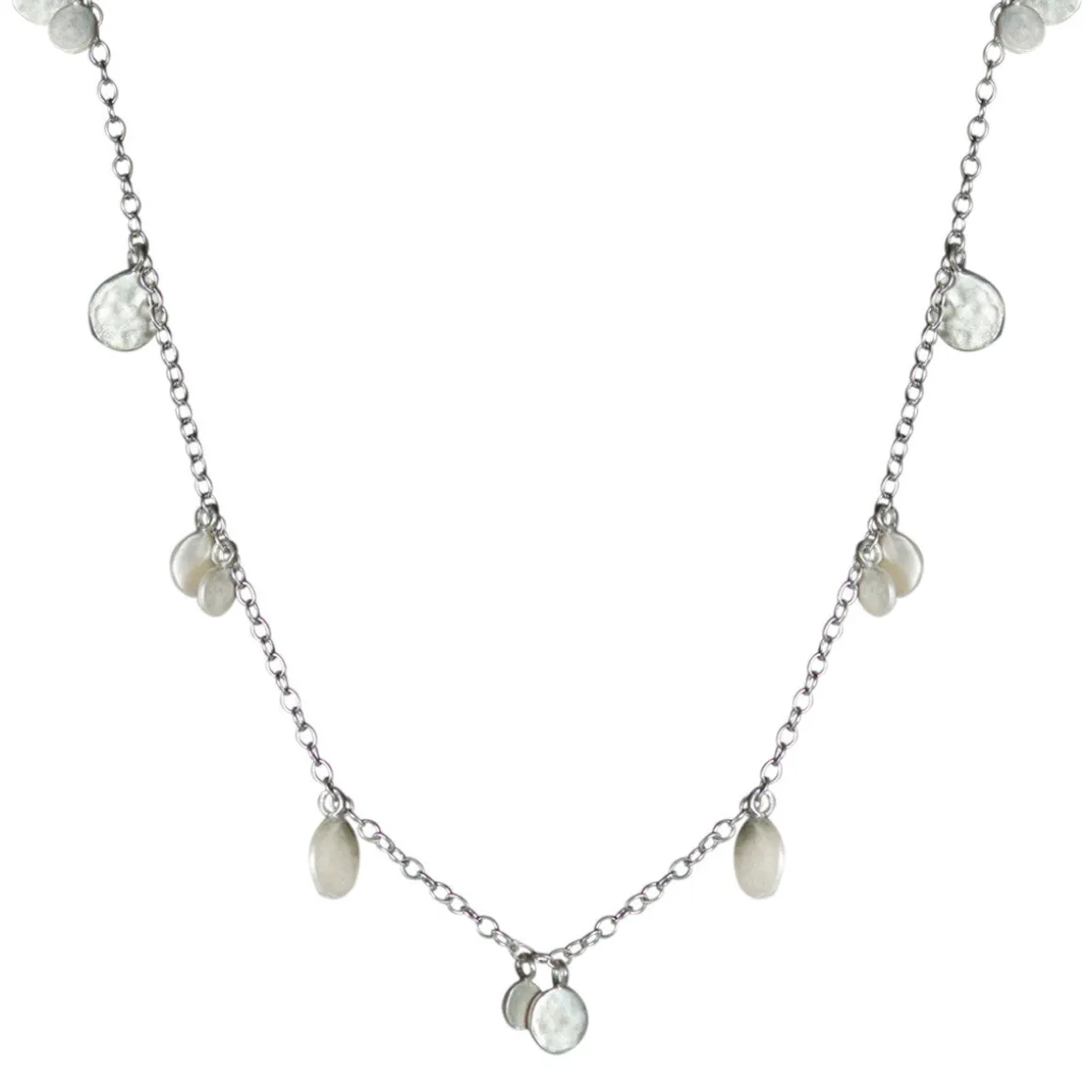 These delicate small hammered discs, ranging in diameter from 1/5″ to 1/3″, hang from silver chain and mimic light flickering across the water. The chain, which is available in 16″, 18″ and 22″ lengths with a silver hook-and-eye closure, is perfect for layering or when worn alone.