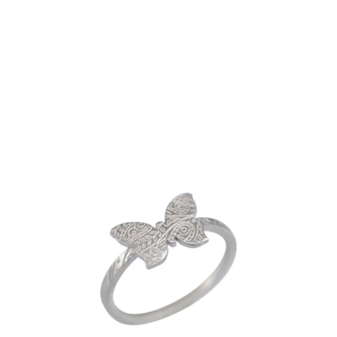 A symbol of renewal and transformation, this recycled sterling silver butterfly ring is the perfect addition to your collection! The butterfly, measuring approximately 3/8″ length and 5/8″ in width, is set on a sterling silver paisley band. The ring is available in sizes 5.5 – 8.