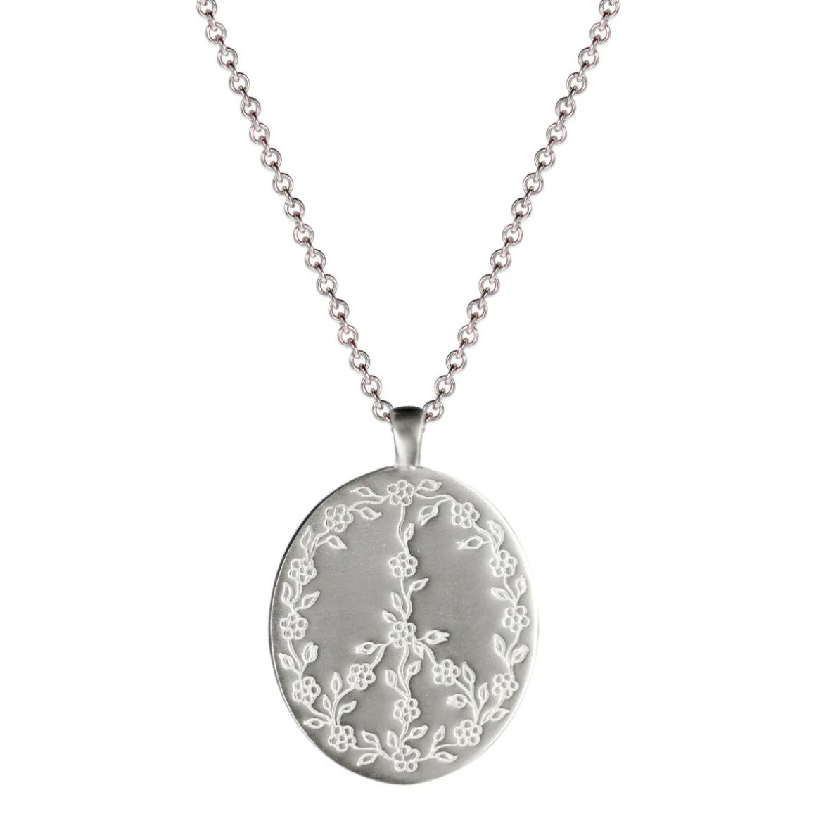 The Peace symbol was created in 1958 by artist Gerald Holtom. This pendant celebrates 50 years of the international symbol of peace and freedom. A garland of flowers form a peace symbol on a recycled sterling silver oval pendant measuring 3/4 inch wide and 1 inch long and hangs from a sterling silver chain with a lobster claw clasp. The reverse side is engraved with “Peace.”