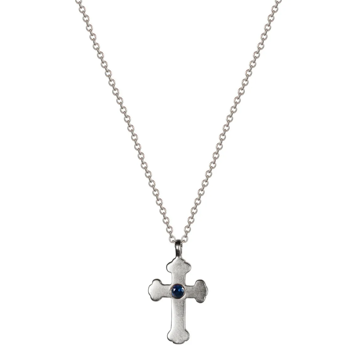 The cross is one of the oldest and most universal of all symbols. It is said to protect against evil and is a source of strength and faith. This recycled sterling silver cross with a beautiful blue sapphire set in the center measures approximately 3/8″ length and 1/4″. The pendant is available on a 16″ or 18″ sterling silver chain with a spring ring closure.