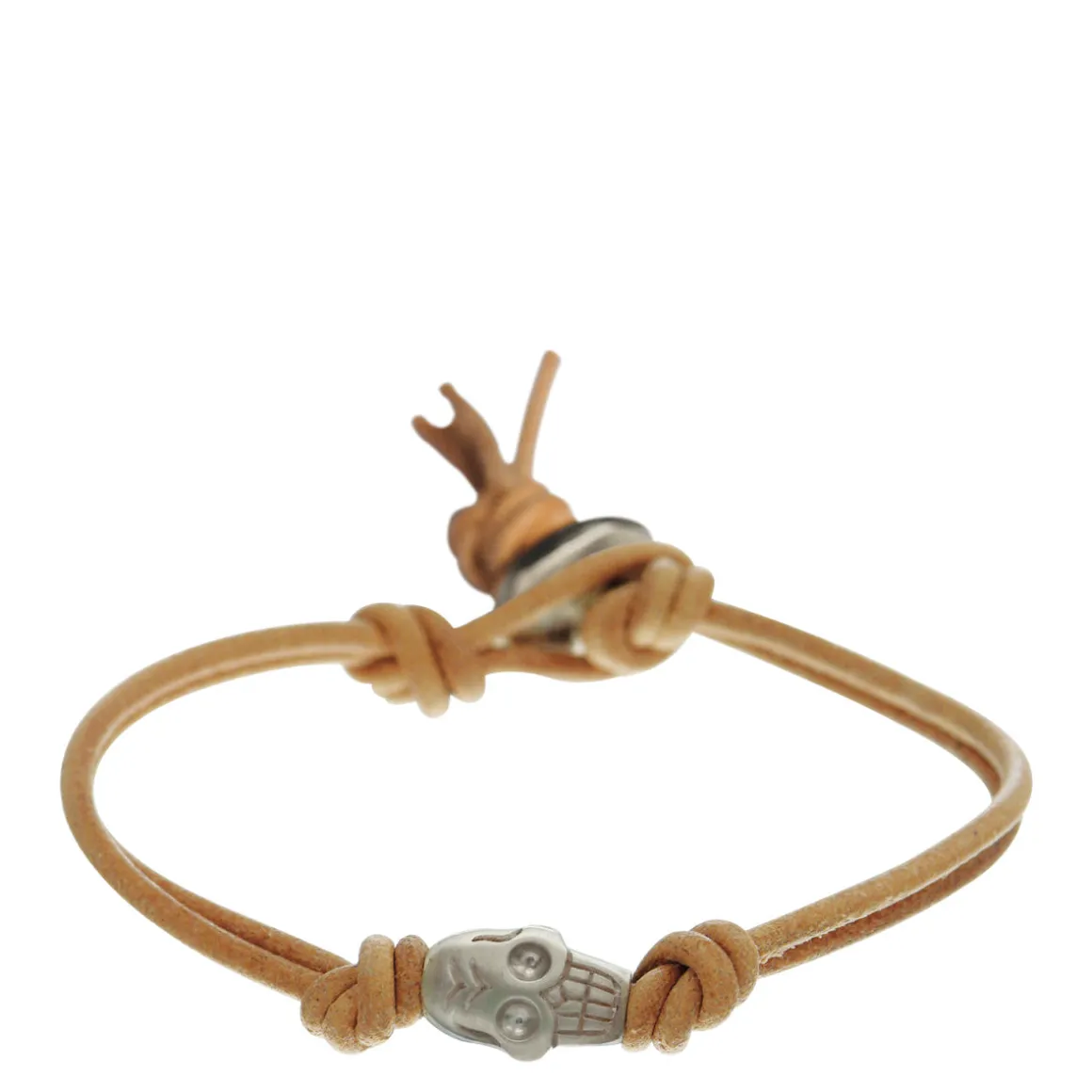 The skull is a reminder that all things will pass, that there is wisdom in living in the face of such mortality, and, therefore, we should live fully and mindfully. This large skull charm ties around the wrist with natural leather cord and has a button closure. The skulls measures approximately 1/2″ in length and 5/16″ in width, and the bracelet is 7″ in length.