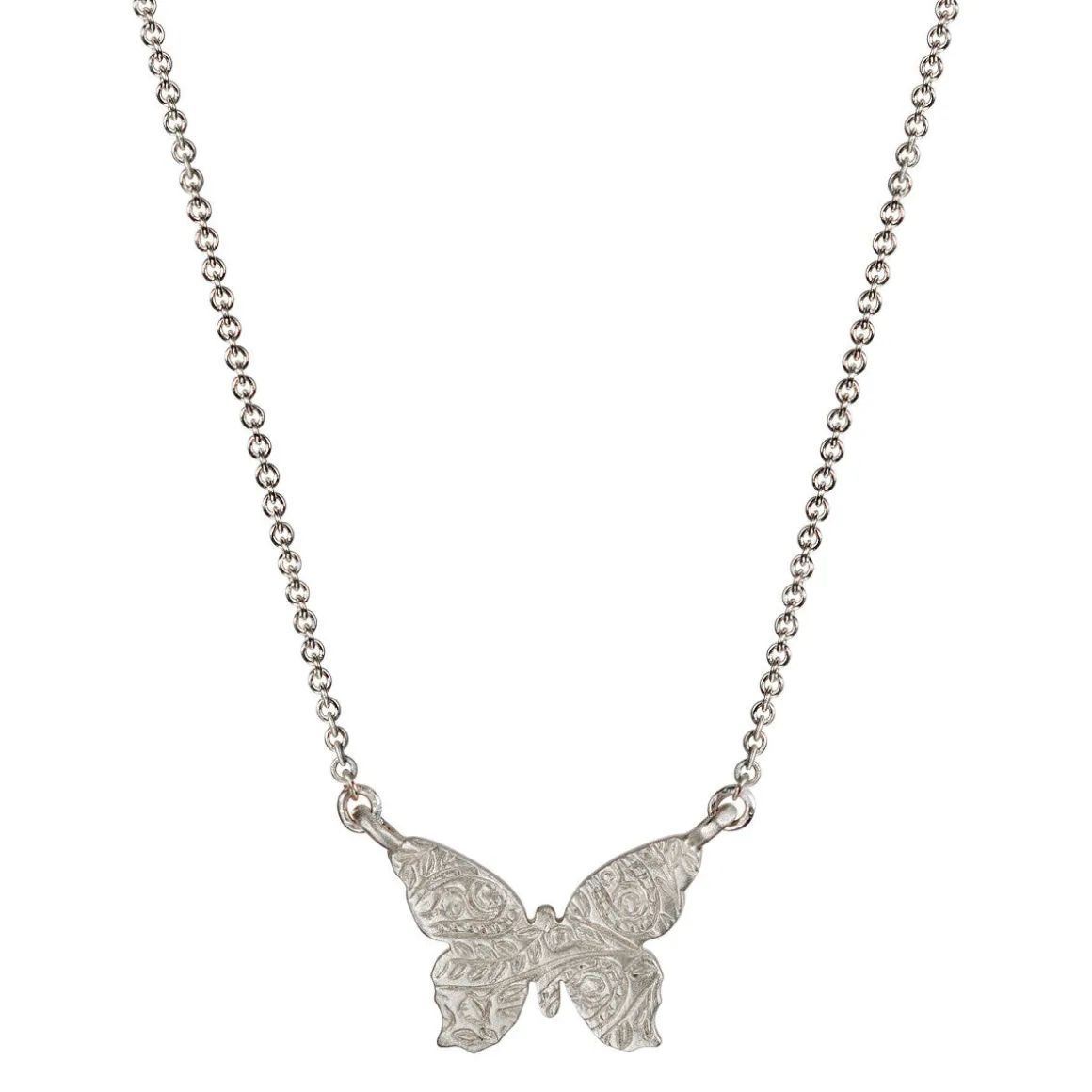 A delicate butterfly pendant is a symbol of renewal and transformation. Engraved with an intricate paisley motif, this recycled sterling silver butterfly is great for everyday wear. The butterfly measures approximately 3/8″ length and 5/8″ in width on 16″ or 18″ sterling silver chain with a spring ring closure.
