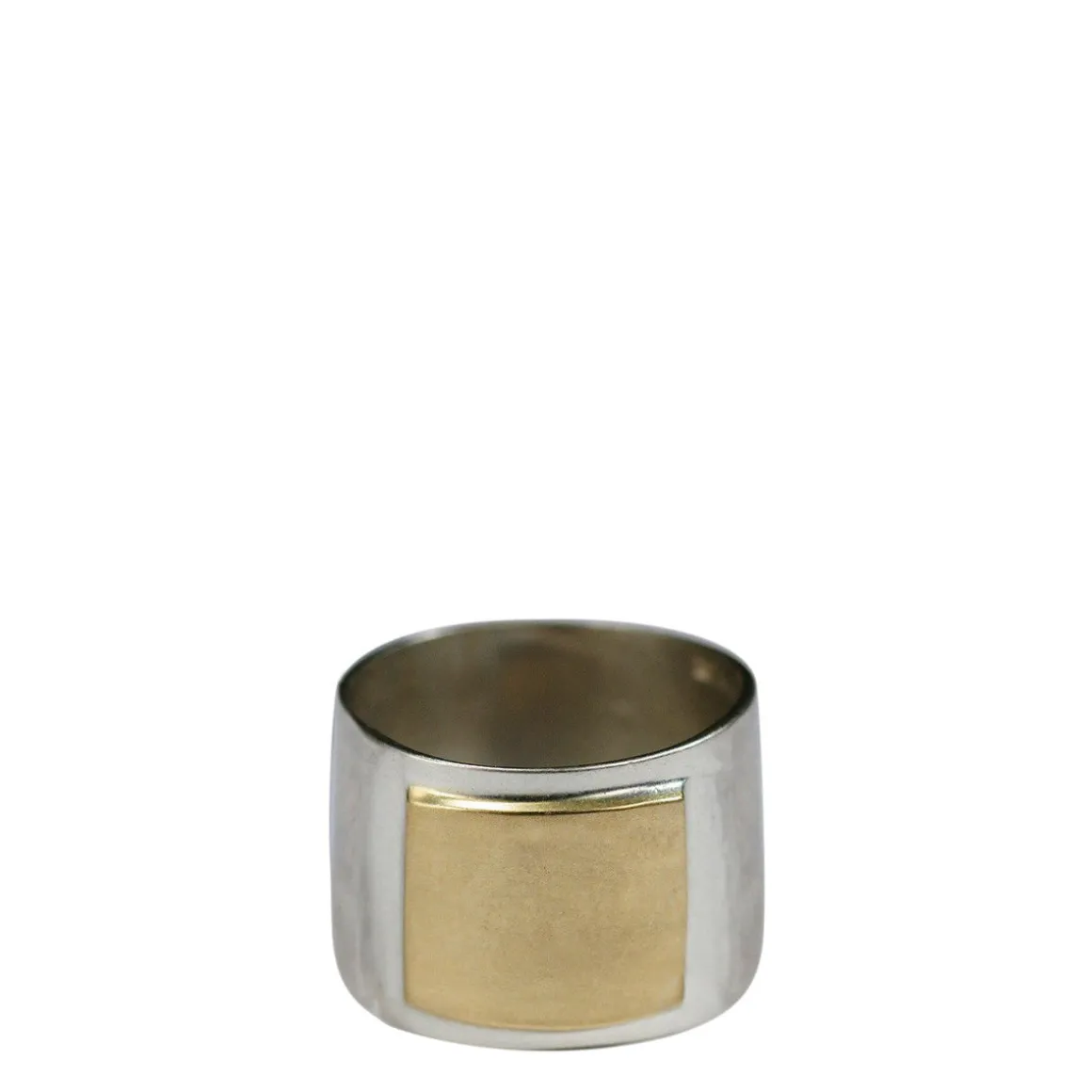 Soft and reflective with a primitive feeling, this wide hammered recycled sterling silver ring features a 10K gold square. Available in sizes 5-8. For this wider band we suggest ordering .5 to 1 full size larger than your normal ring size.