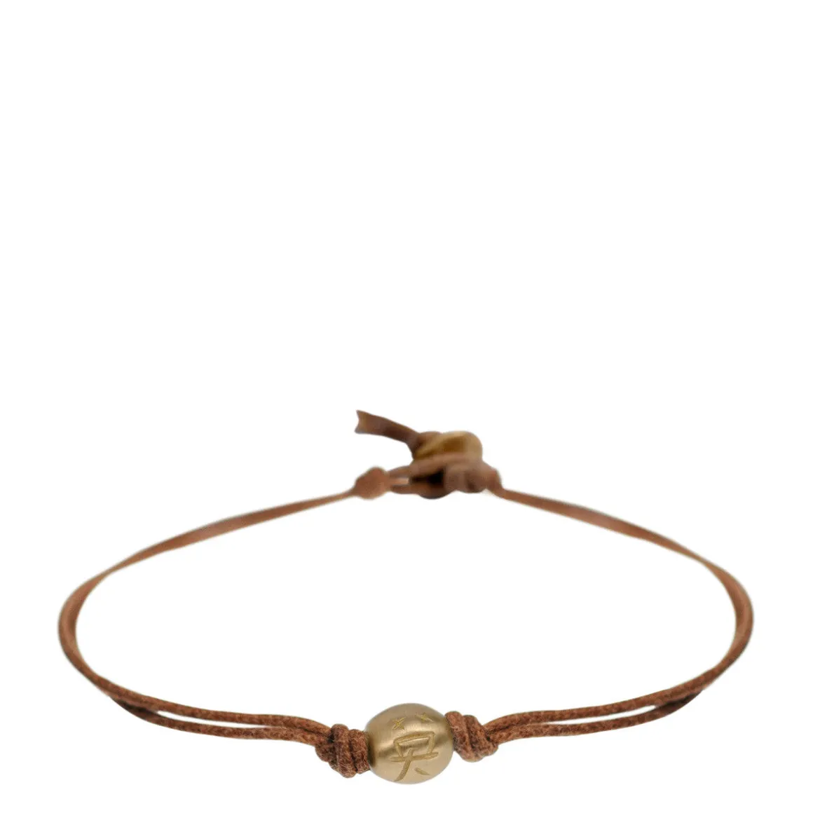 A round recycled 10K gold bead engraved with the Chinese character ‘Ying’ for courage, sits between two knots on waxed natural cotton cord. The bead measures 5/16″ in diameter. The bracelet is 7″ in length with a 10K gold button closure.