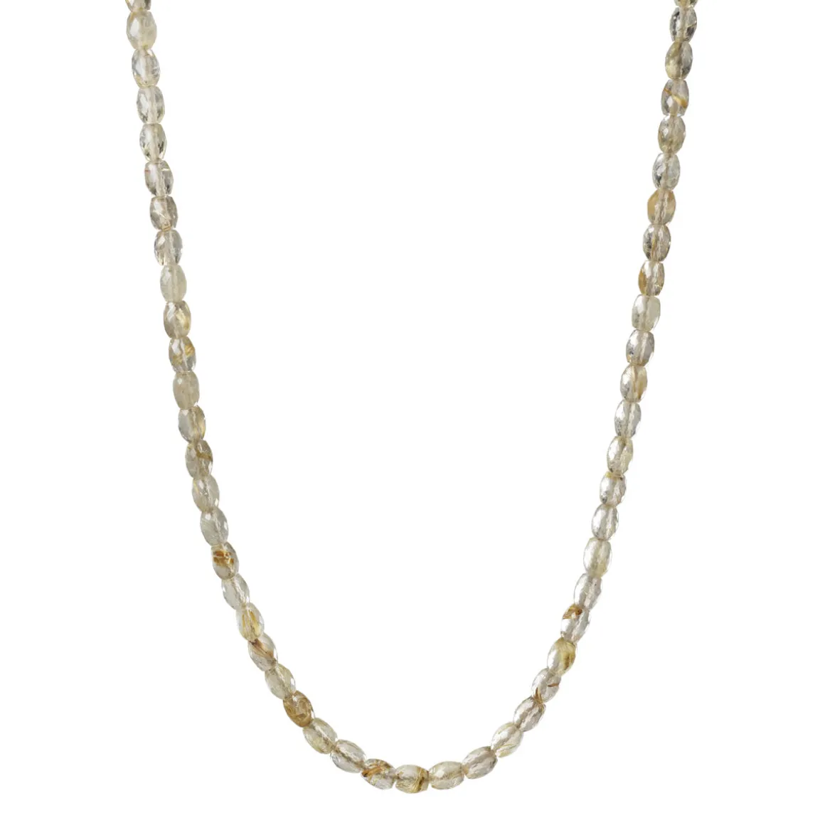 A strand of pure magic. Custom-cut rutilated quartz oval beads – known throughout history as Cupid’s Darts, Venus Hair Stone, and Flèches D’Amour – are hand-strung on natural cord to create a shimmering talisman said to attract love and bring harmony to the heart. Each 7×5mm bead flashes with golden threads, and the 22-inch necklace is finished with a warm 10K gold button closure. All stones are ethically sourced.