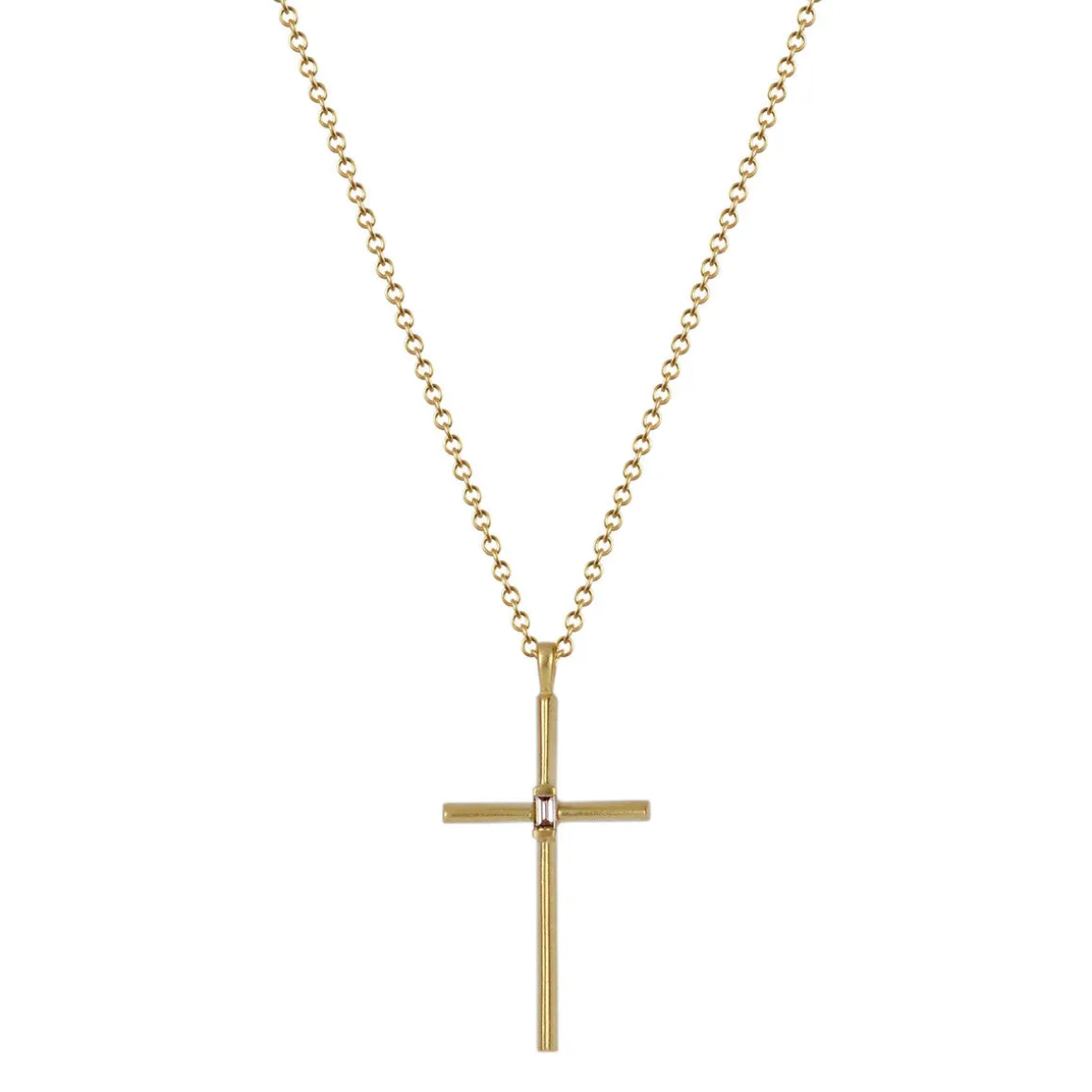 Our 18K fine cross pendant is delicate, understated and timeless.with abaguette champagne diamond at the focal point. This recycled pendant is available in 16″ and 18″ lengths. The cross measures approximately 7/8″ in length and 1/2″ in width. The approximate total carat weight is 0.034. All diamonds are conflict-free.