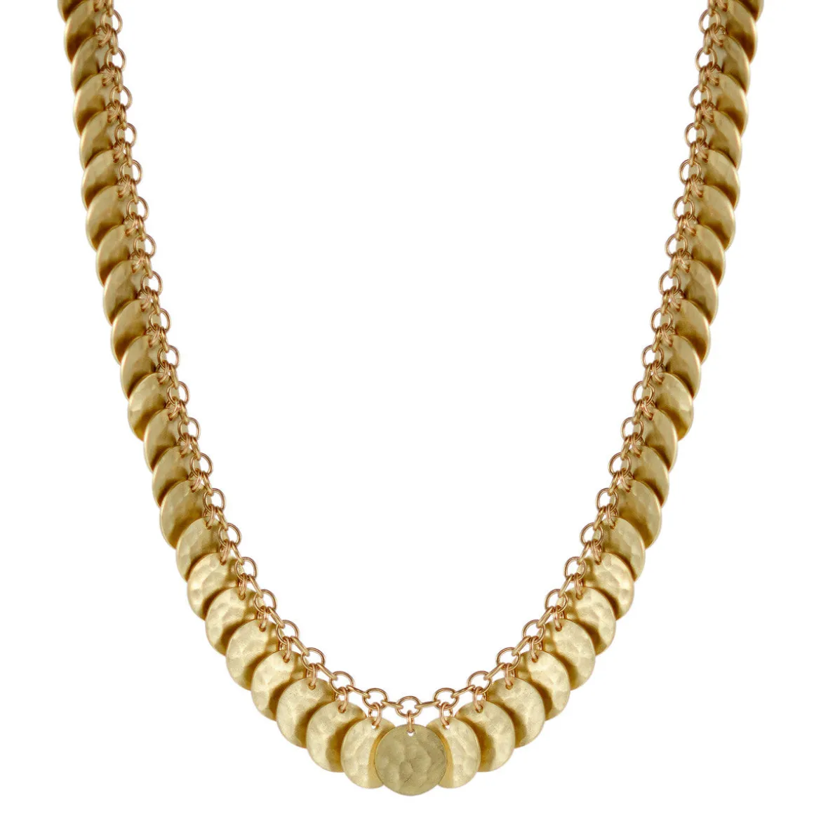 Soft and reflective, this necklace has a look that is primitive in feeling, yet modern in its aesthetic. Our recycled 18K gold full chain features hammered discs of gold that glimmer with textured movement. This necklace is available in 16″ and 18″ lengths and is finished with an 18K recycled gold clasp.