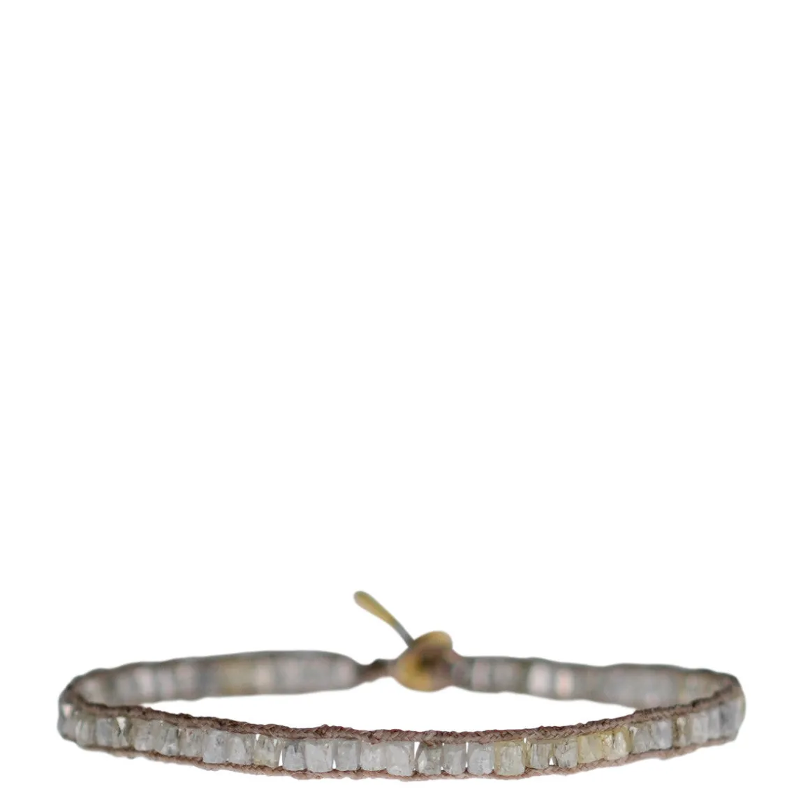 Simple and elegant, this recycled 18K gold bracelet showcases the natural beauty of grey diamonds. Small sparkling grey diamond tube beads are hand sewn between natural cotton cords on this recycled 18K gold bracelet. The bracelet measures approximately 1/4″ wide and 6.5″ in length and has an 18K gold button closure and the end cord is capped in 18K gold. The approximate total carat weight is 6.12. All diamonds are conflict free.