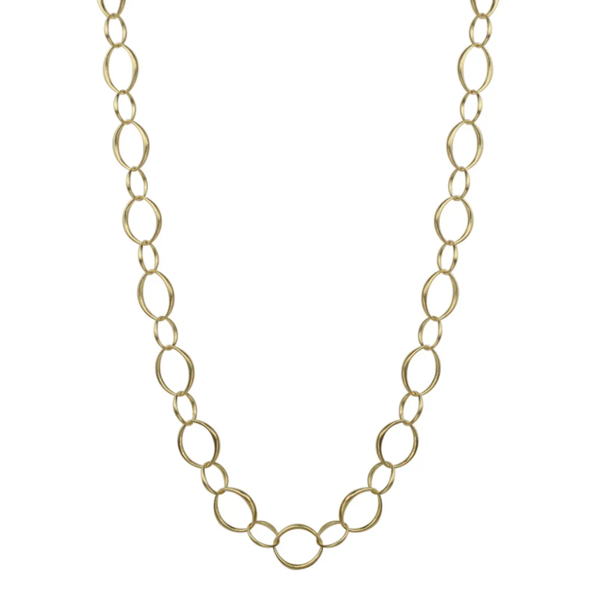 Inspired by iconic gold chains from the 70’s, the O’ link was created. Creating an airy and sculptural elegance, these recycled 18K gold chains are designed to be piled on. The outside diameter of the small O’ link measures approximately 7mm in width and 8mm in height. The outside diameter of the large O’ link measures approximately 10mm x 11mm. This limited edition necklace is available in 18 inches and is finished with a handmade hook and eye closure.