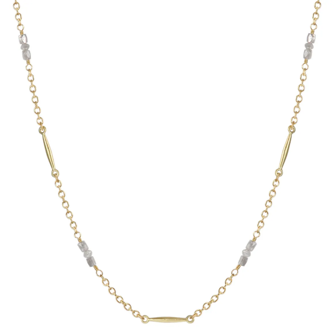 Solid gold and sculptural elements become feminine and beautiful. This recycled necklace is liquid gold and features lures suspended on beaded 18K gold chain. Trios of opaque diamond tube and rondelle beads are hand wrapped on recycled 18K gold wire. The necklace is available in 16″, 18″ and 24” lengths and is finished with an easy lock closure. The approximate total carat weight ranges from 2.4 to 4.2. All diamonds are conflict free.