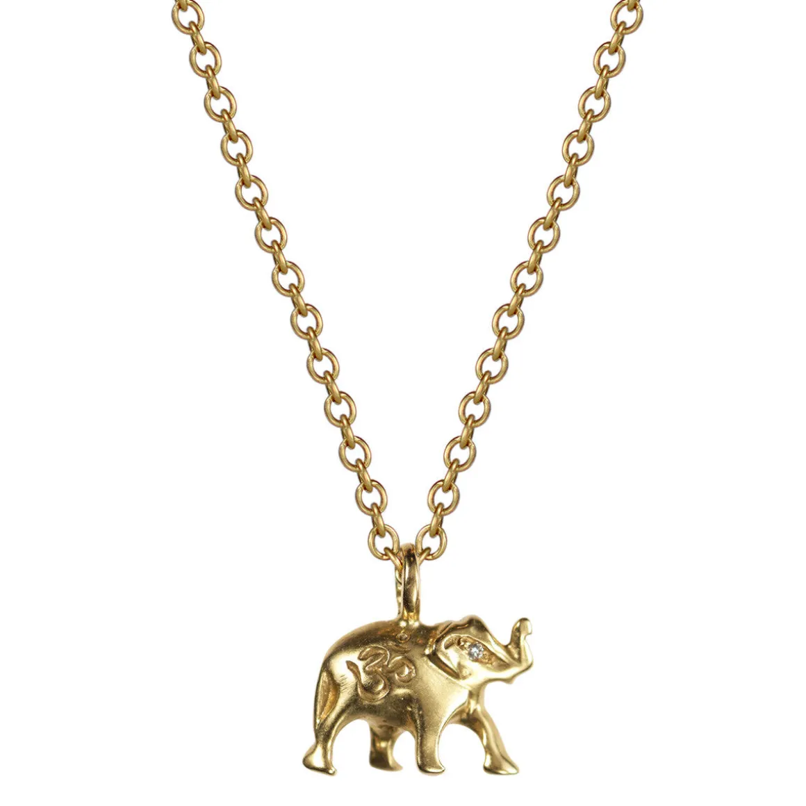 The Elephant is a revered symbol of luck, prosperity and wisdom. An elephant in stride is cast in recycled 18K gold and is engraved with an ‘Om’ and has two diamond eyes. ‘Om’ is the sound of the universe. It represents the divine and stands for the whole world and the sum of its parts; including past, present and future. The elephant measures approximately 1/2″ in length and 3/8″ width on a 16″ or 18″ 18K gold chain with a spring ring closure. All diamonds are conflict free.