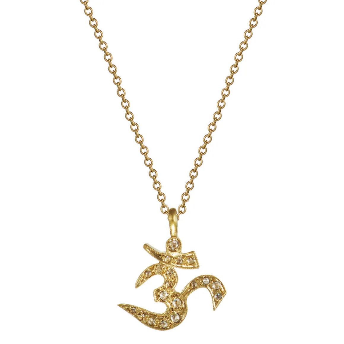 ‘Om’ is the most sacred mantra in Hinduism and represents the divine. This beautiful recycled 18K gold pav̩é Indian diamond pendant hangs on a 16″ or 18″ 18K gold chain with a hook-and-eye closure. The pendant measures approximately 5/8″ in length and 1/2″ in width. All diamonds are conflict free.