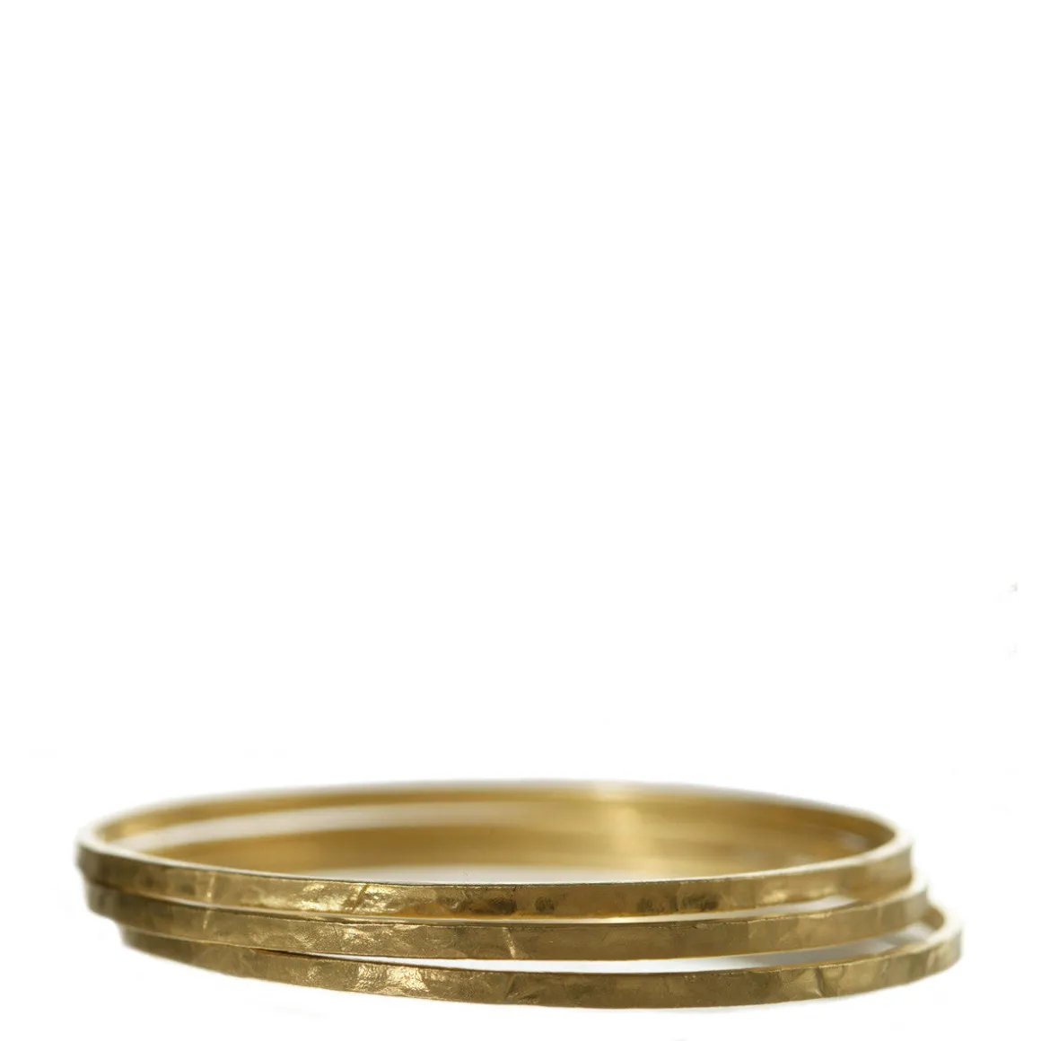 Soft and reflective with a primitive feeling, these three recycled 18K gold bangles are elegant and sophisticated, yet down to earth. Each bangles measures approximately 1/8″ in width and 2 1/2″ in diameter.