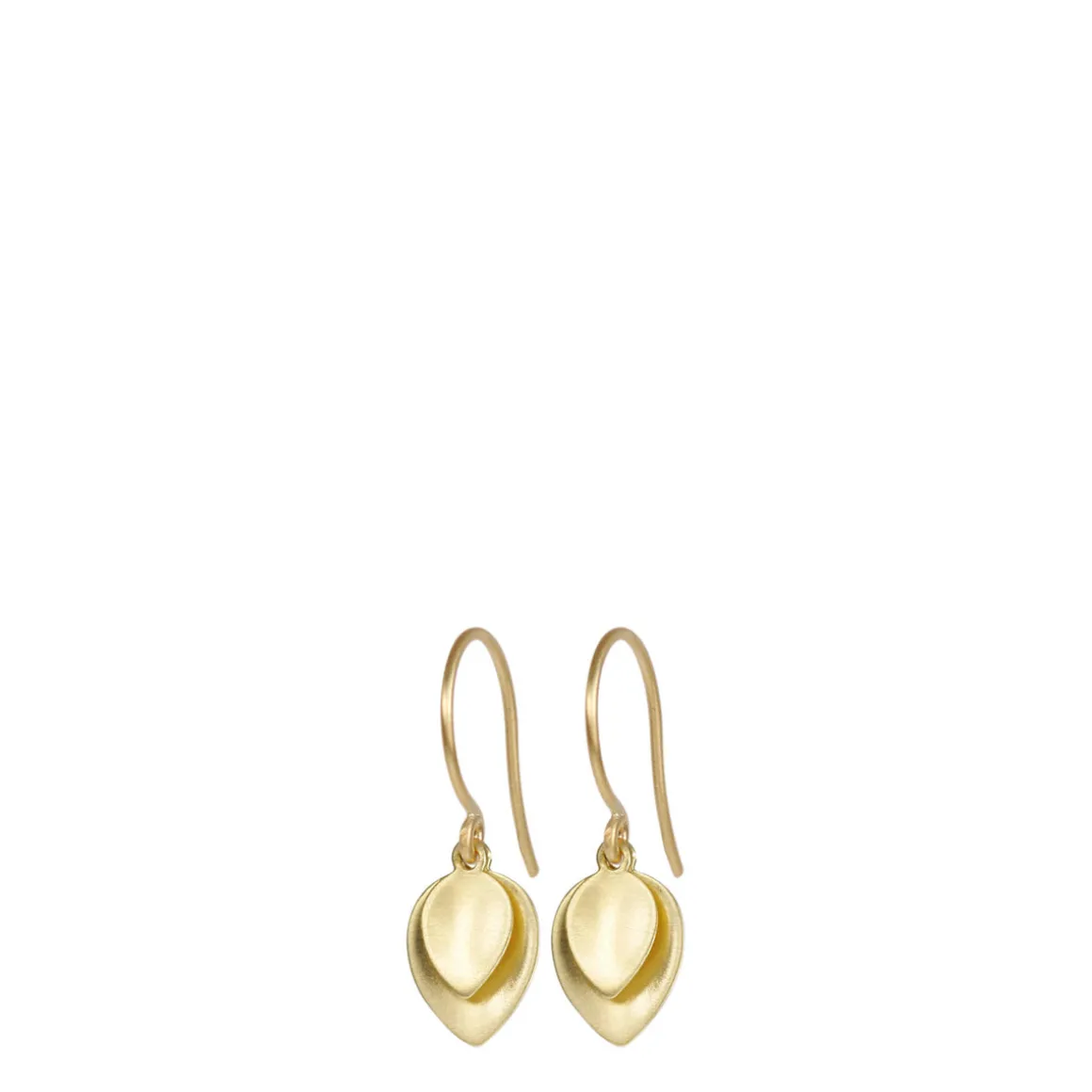 The lotus petal is the heart’s inner shrine, a reminder that we all have the ability to rise above and overcome life’s difficulties. Gold lotus petals are layered one atop the other in these recycled 18K gold earrings. The large lotus petal measures approximately 3/8” in length and 1/4″ in width, while the smaller petal measures approximately 7/16” in length and 3/16″ in width. The petals hang from recycled 18K gold ear wire.