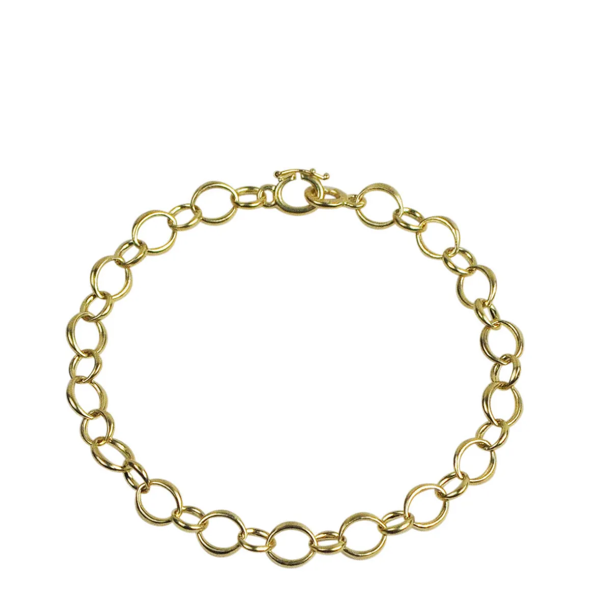 Fluid, feminine and timeless, this recycled 18K gold bracelet is beautiful stacked or worn on its own. Inspired by iconic gold chains from the 70’s. The outside diameter of the small O’ link measures approximately 5.5mm in width and 6mm in height. The outside diameter of the large O’ link measures approximately 6.5mm x 7mm. The bracelet measures 7 ½” long and is finished with a cross locking link closure and a figure eight safety catch.