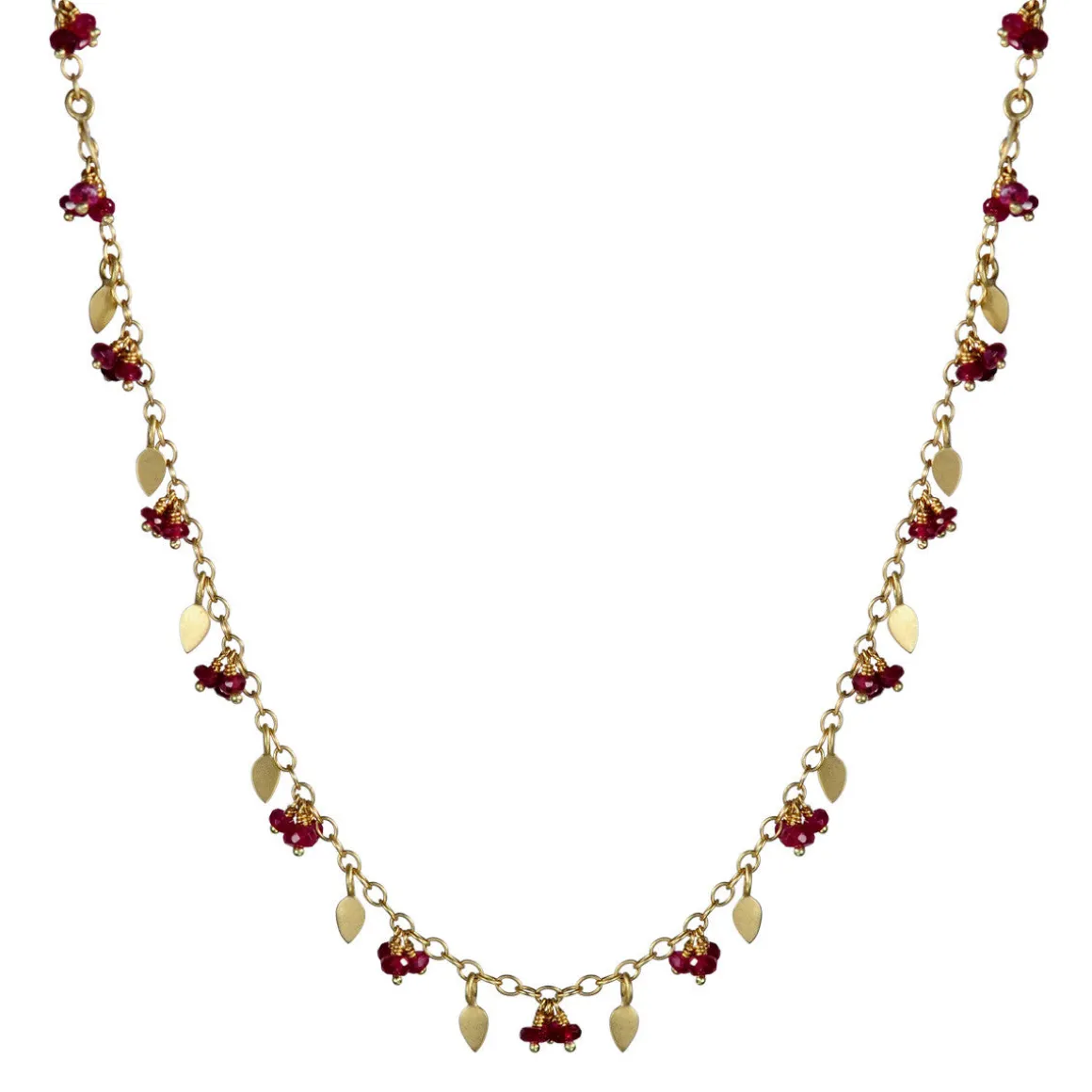 Delicate recycled 18K gold petals and ruby beads create a sparkly and elegant chain. The chain is available in 16″ or 18″ with a hook-and-eye closure.