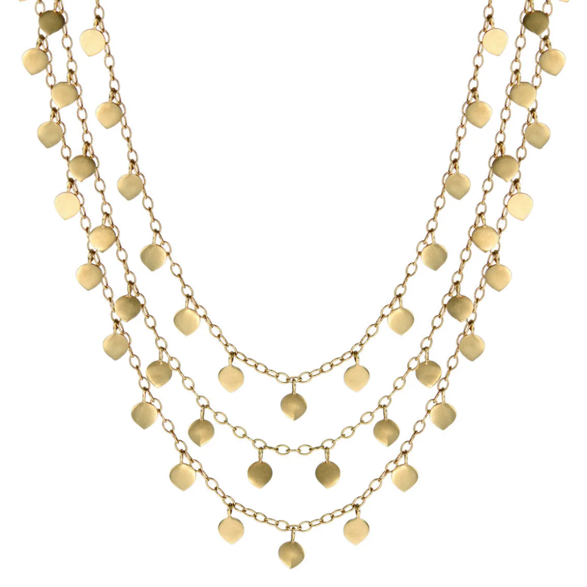 The lotus flower is the heart’s inner shrine. It is the symbol of creation and manifestation in the Hindu religion. Inspired by the power and beauty of the lotus, recycled 18K gold lotus petals hang from three layers of graduated chain. This elegant and classic necklace shimmers beautifully at night, but is delicate enough to wear during the day. The shortest strand measures 14″ and longest strand measures 17″ with a hook and eye closure.