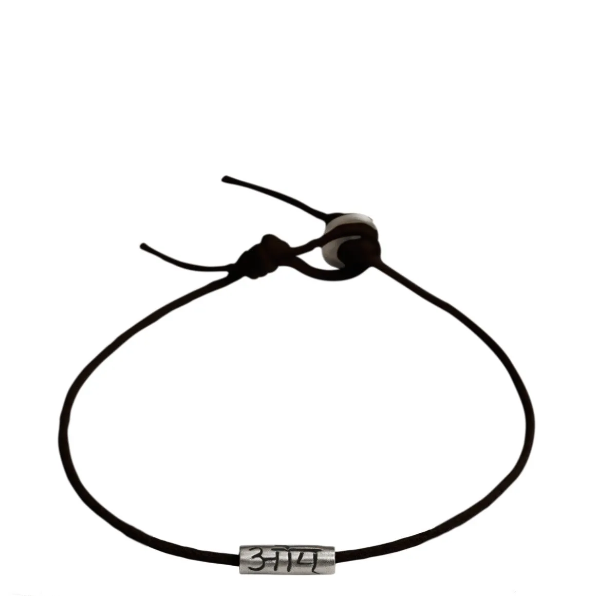 A recycled sterling silver tube bead is engraved with the Sanskrit symbol for ‘Om,’ the breath of life. The bead measures approximately 1/2″ in length and 1/4″ in width and is strung on black cotton cord finished with a sterling silver button. The bracelet measures 8″ in length.