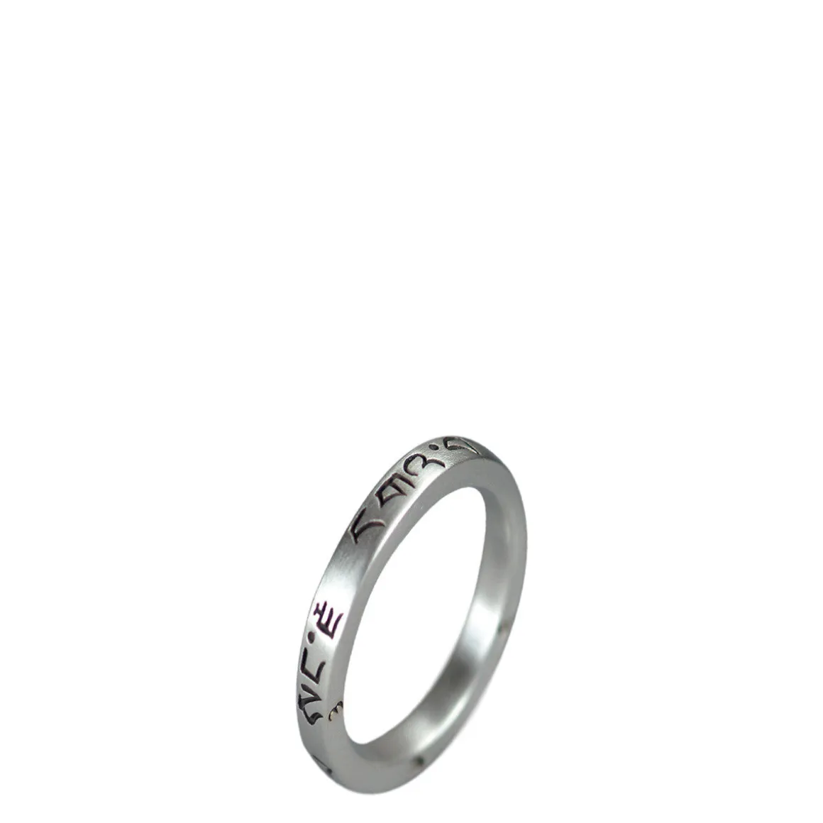 The Tibetan vow of the ‘Four Immeasurables’ encourages us to focus our attention on helping others and speaks of Love (Maitri), Compassion (Karuna), Joy (Mudita) and Equanimity (Upeksa). The vow is engraved in Tibetan on a recycled sterling silver square shaped ring, measuring approximately 1/8″ wide.