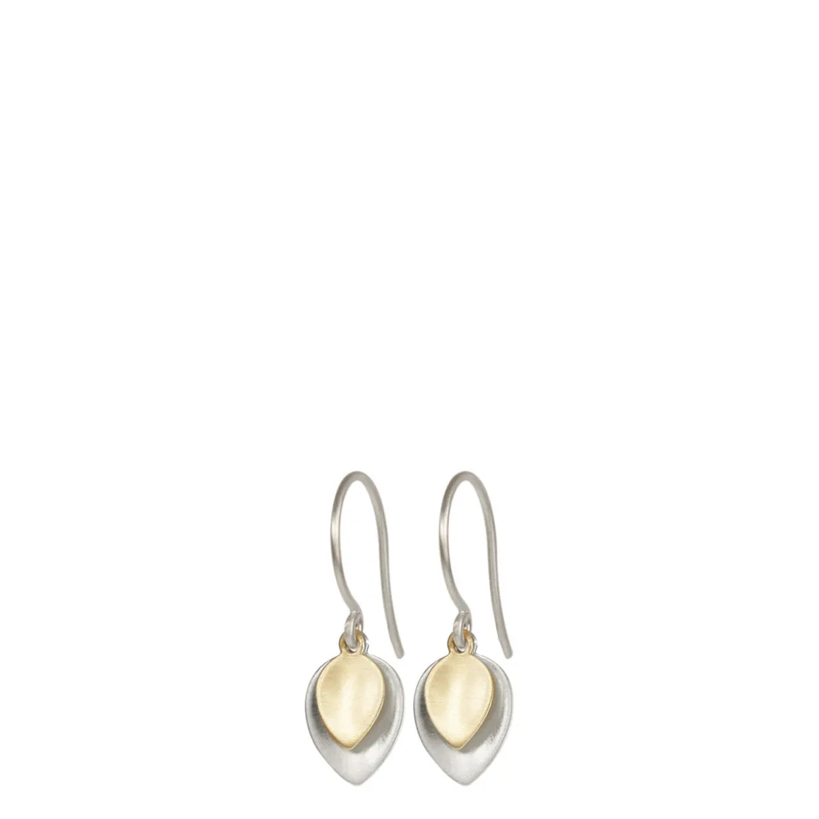 The lotus petal is the heart’s inner shrine, a reminder that we all have the ability to rise above and overcome life’s difficulties. These recycled sterling silver lotus petal earrings are layered with a smaller 10K gold lotus petal dangling from the top, adding subtle movement to the graceful earrings.The large lotus petal measures approximately 3/8” in length and 1/4″ in width, while the smaller petal measures approximately 7/16” in length and 3/16″ in width. The petals hang from recycled sterling silver ear wire.