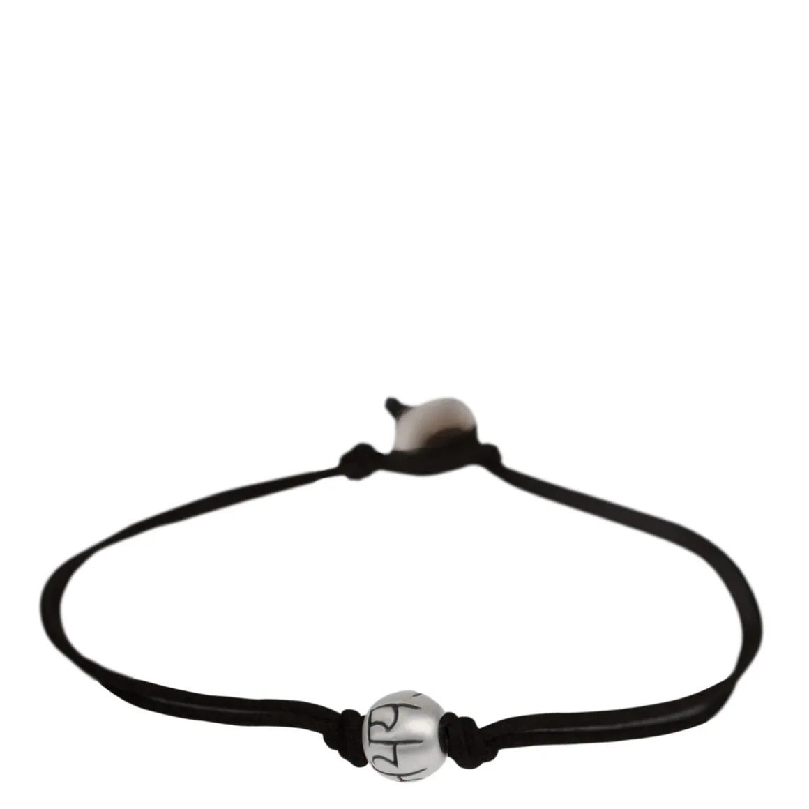 A recycled sterling silver bead, engraved with the Sanskrit symbol ‘Abhaya’ or ‘Fearlessness,’ sits between two knots on waxed black cotton cord with a sterling silver button closure. The bead is approximately 1/4″ in diameter and the bracelet measures 7″ in length.