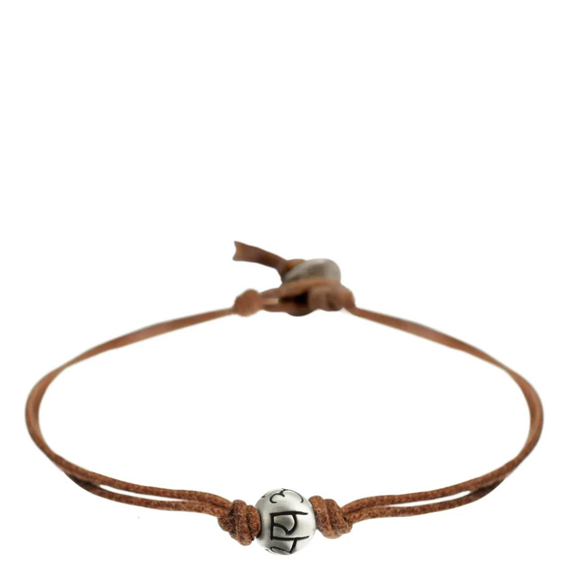 A recycled sterling silver bead, engraved with the Sanskrit symbol ‘Abhaya’ or ‘Fearlessness,’ sits between two knots on waxed natural cotton cord with a sterling silver button. The bead is approximately 1/4″ in diameter and the bracelet measures 7″ in length.