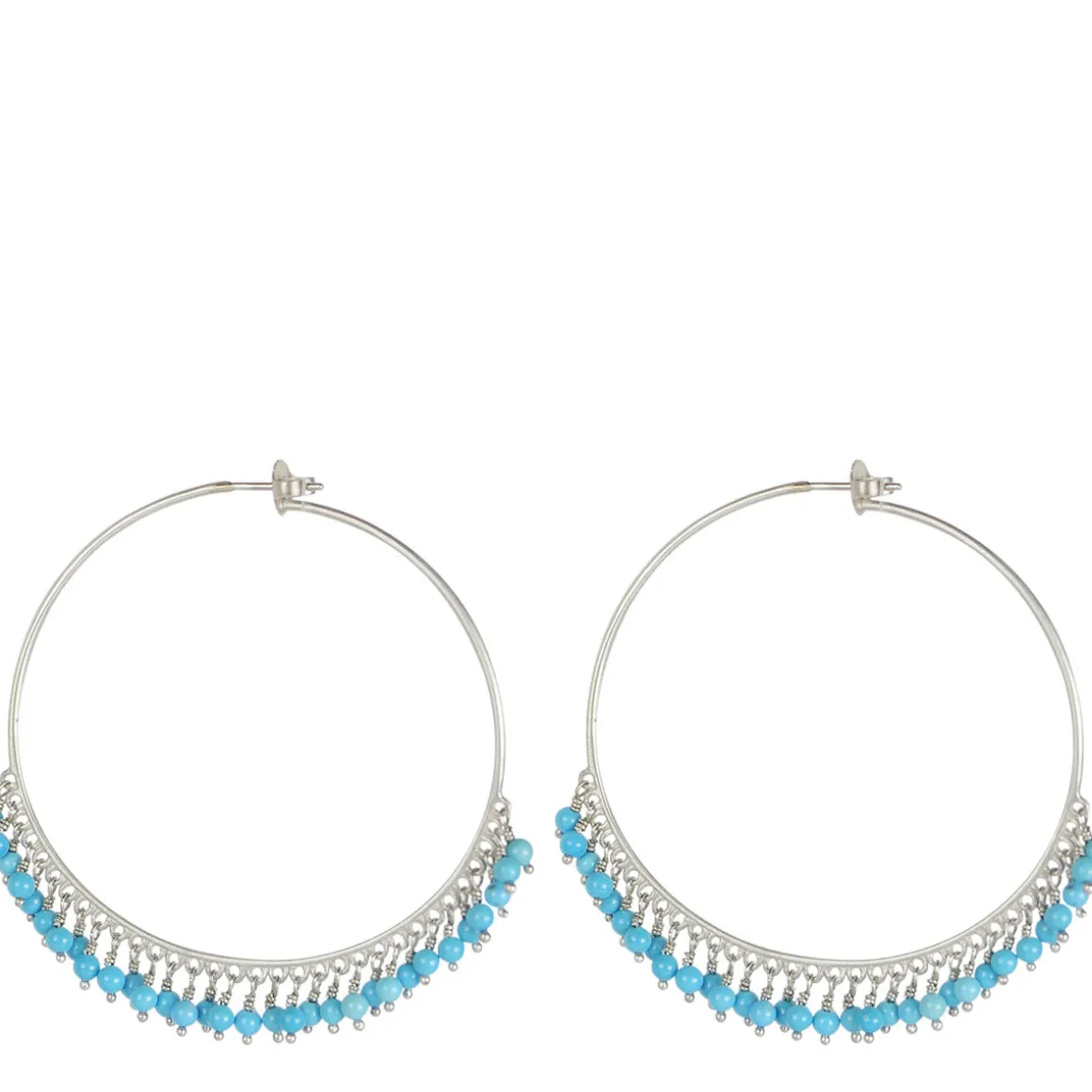 Reminiscent of the bohemian glamour of the 1970’s, these recycledsterling silver hoops are hand beaded with turquoise, shimmering with movement. These lightweight hoops measure approximately 2″ in diameter.